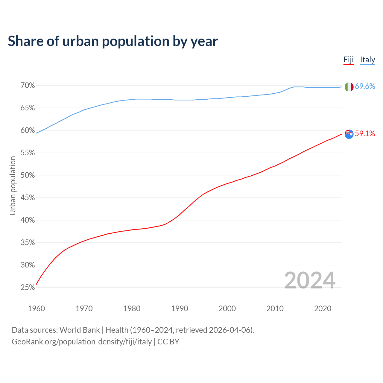 From 2004 to 2024, the share of urban population changed from 49.5% to 59.1% in Fiji and from 67.5% to 69.6% in Italy.