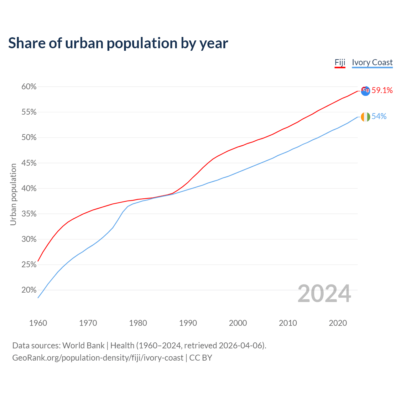 From 2004 to 2024, the share of urban population changed from 49.5% to 59.1% in Fiji and from 44.7% to 54% in Ivory Coast.