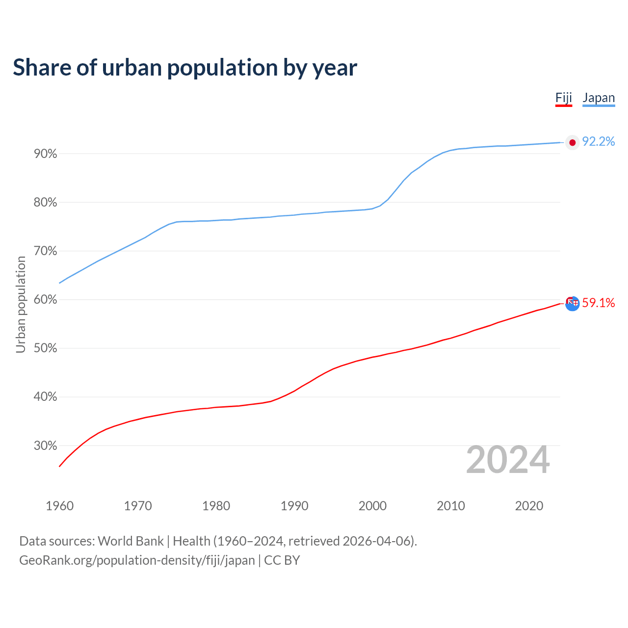 From 2006 to 2026, population density in Fiji increased by 5.3%, compared to a 4.07% decline in Japan.