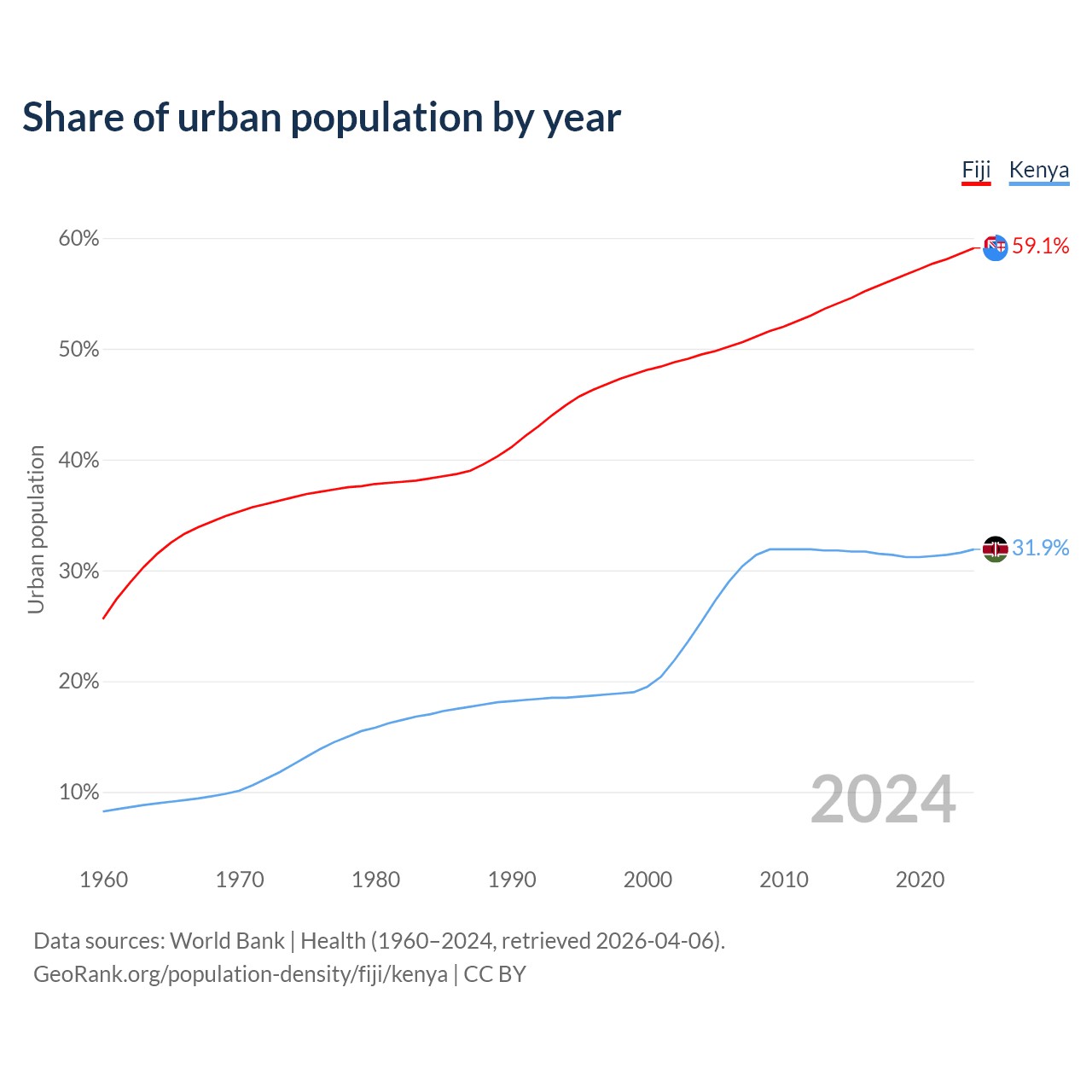 From 2004 to 2024, the share of urban population changed from 49.5% to 59.1% in Fiji and from 25.4% to 31.9% in Kenya.