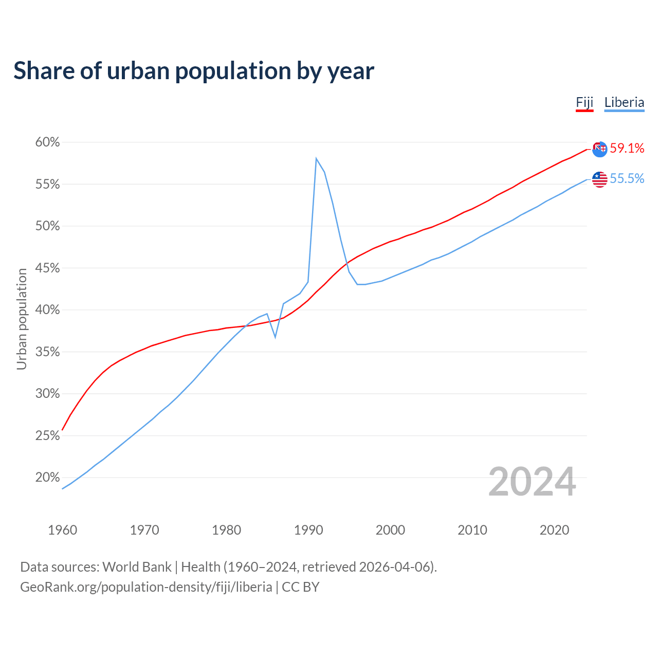 From 2006 to 2026, population density in Fiji increased by 5.3%, compared to a 67.6% growth in Liberia.