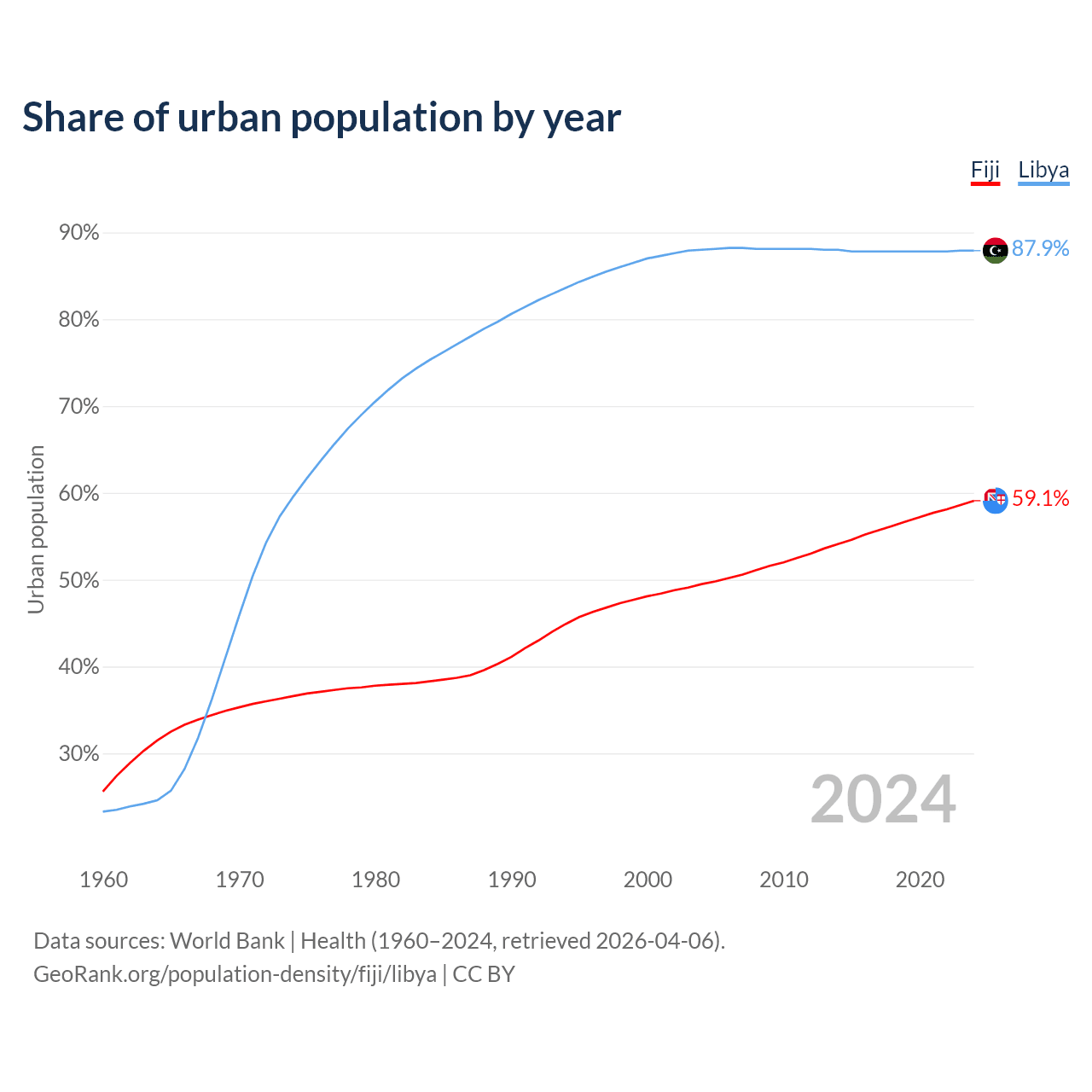 From 2006 to 2026, population density in Fiji increased by 5.3%, compared to a 26% growth in Libya.