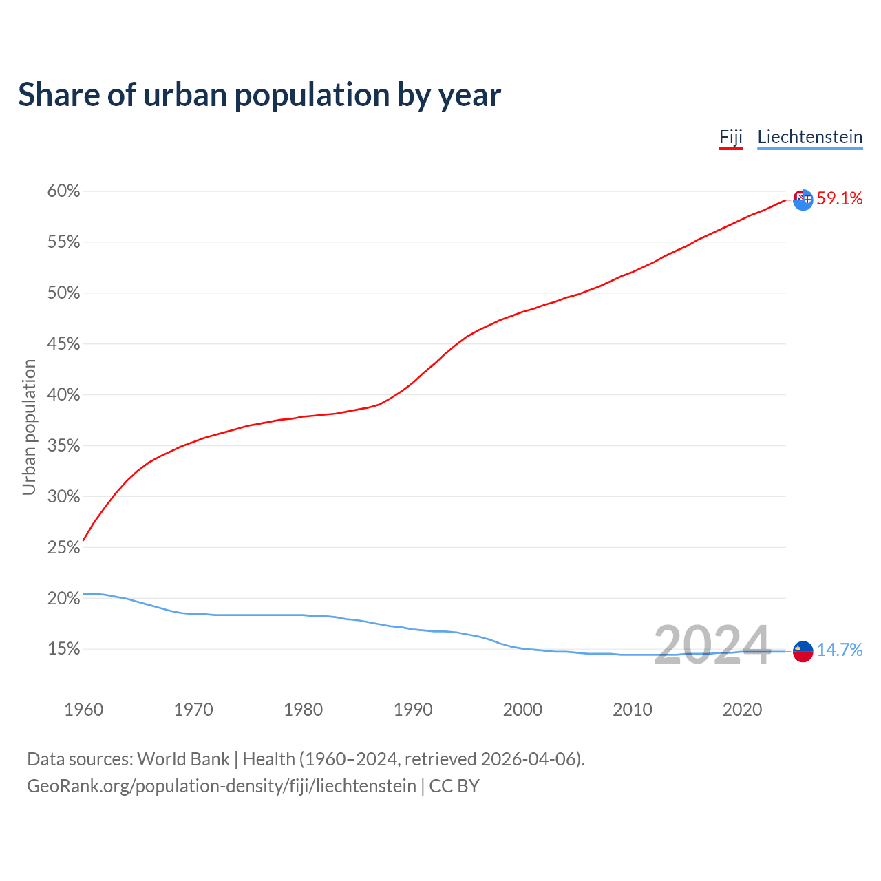From 2004 to 2024, the share of urban population changed from 49.5% to 59.1% in Fiji and from 14.7% to 14.7% in Liechtenstein.