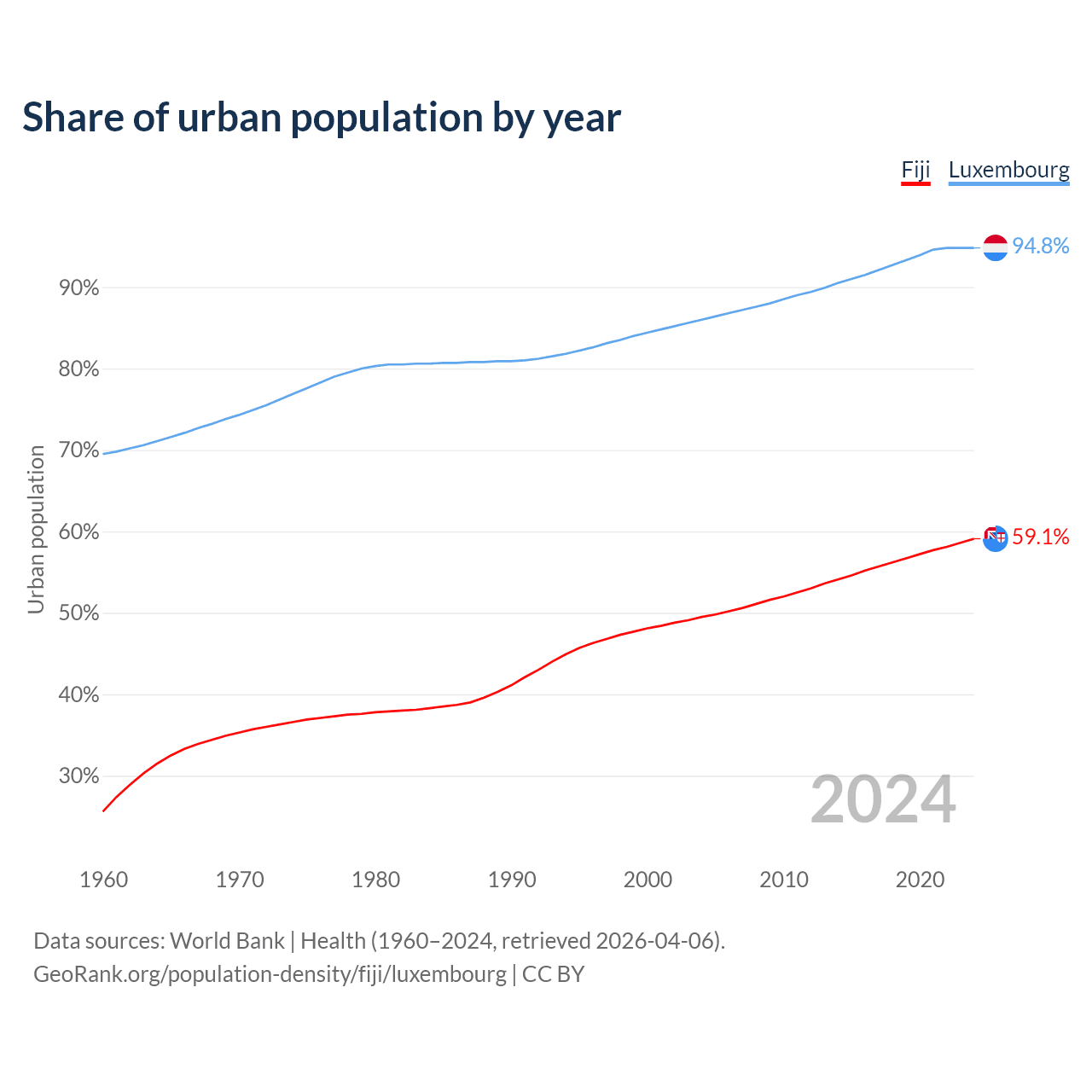 From 2004 to 2024, the share of urban population changed from 49.5% to 59.1% in Fiji and from 86% to 94.8% in Luxembourg.