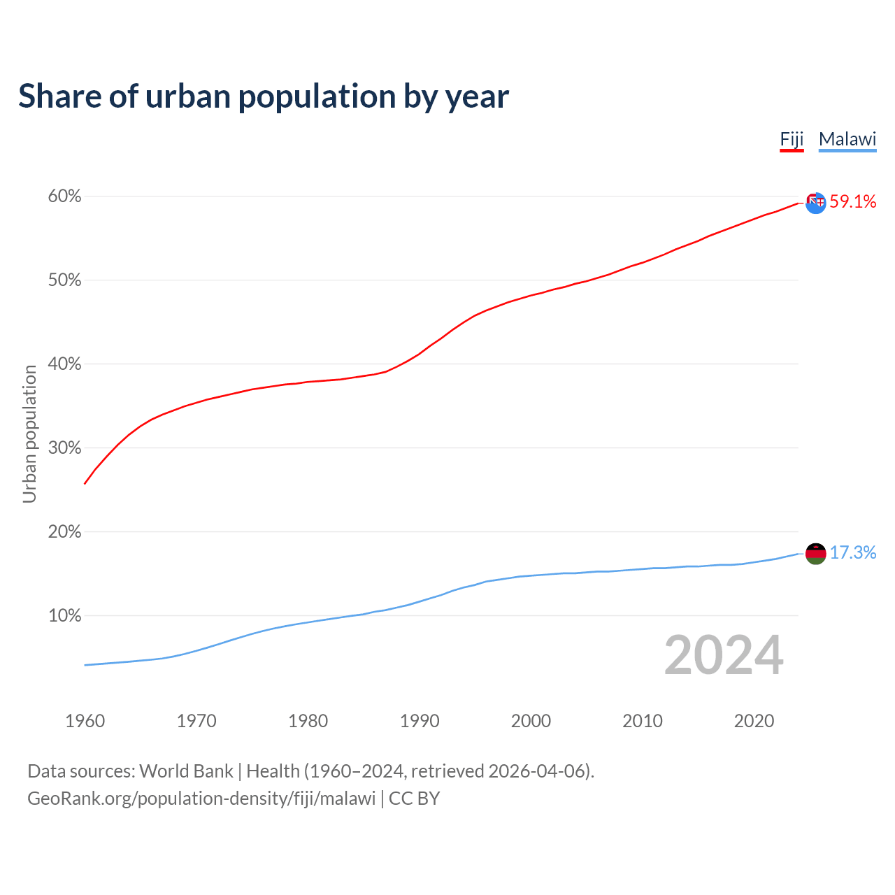 From 2004 to 2024, the share of urban population changed from 49.5% to 59.1% in Fiji and from 15% to 17.3% in Malawi.