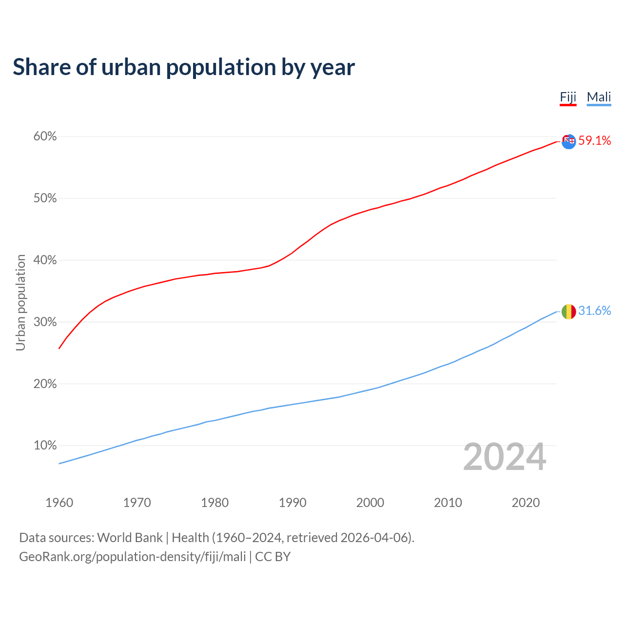 From 2004 to 2024, the share of urban population changed from 49.5% to 59.1% in Fiji and from 20.5% to 31.6% in Mali.
