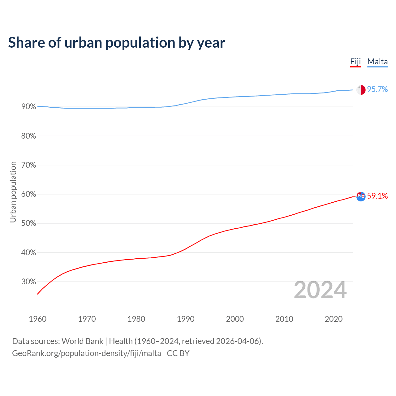 From 2004 to 2024, the share of urban population changed from 49.5% to 59.1% in Fiji and from 93.6% to 95.7% in Malta.