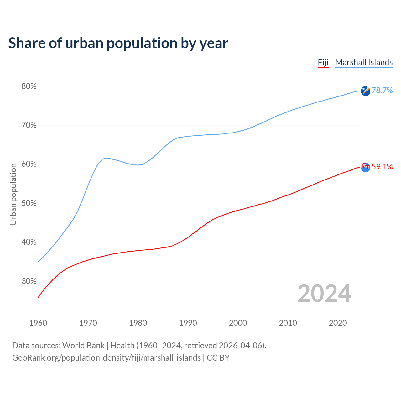 From 2004 to 2024, the share of urban population changed from 49.5% to 59.1% in Fiji and from 70.1% to 78.7% in the Marshall Islands.