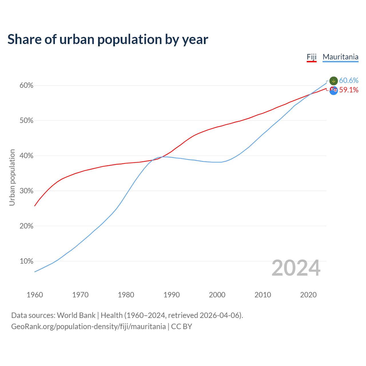 From 2004 to 2024, the share of urban population changed from 49.5% to 59.1% in Fiji and from 39.6% to 60.6% in Mauritania.