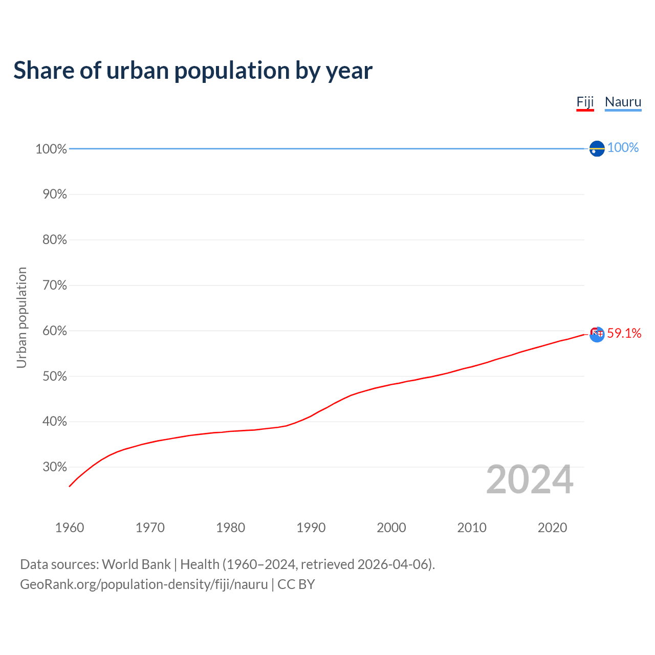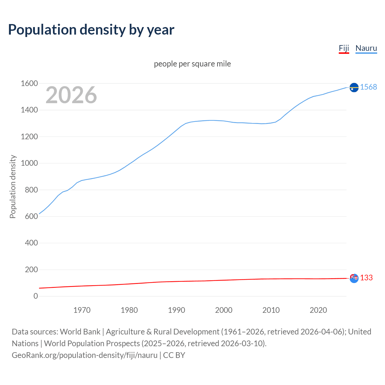 From 2006 to 2026, population density in Fiji increased by 5.3%, compared to a 20.6% growth in Nauru.