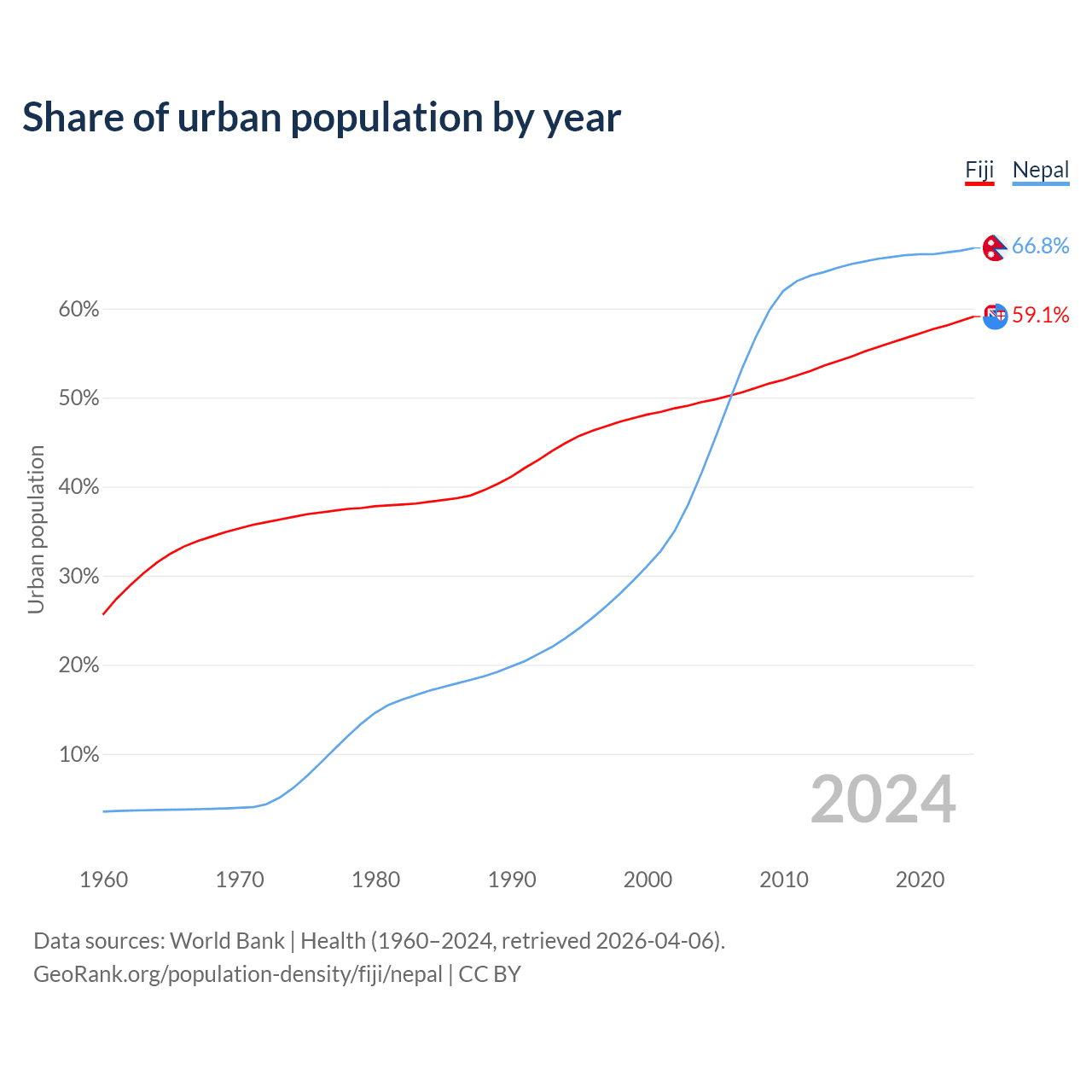 From 2004 to 2024, the share of urban population changed from 49.5% to 59.1% in Fiji and from 41.6% to 66.8% in Nepal.