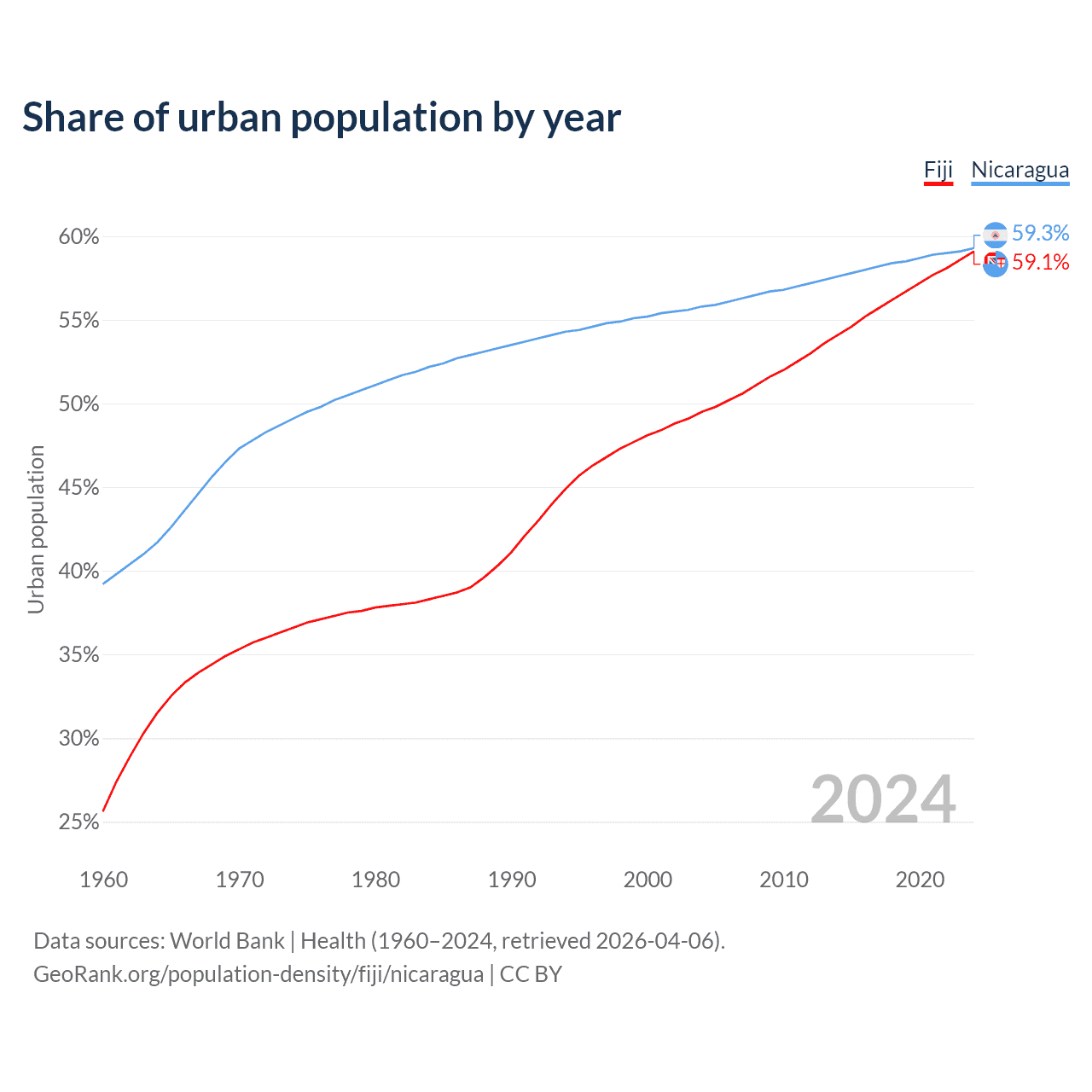 From 2004 to 2024, the share of urban population changed from 49.5% to 59.1% in Fiji and from 55.8% to 59.3% in Nicaragua.