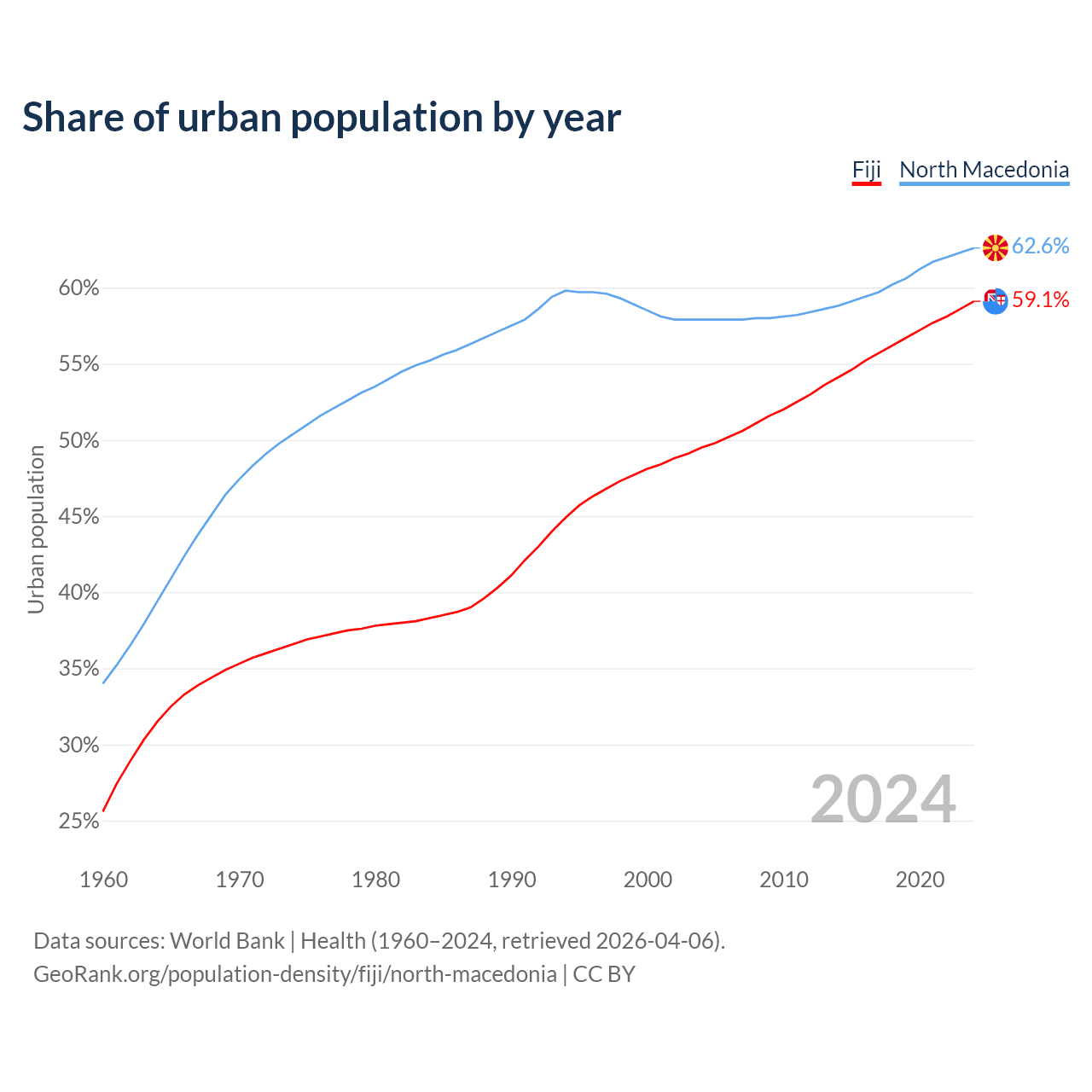 From 2004 to 2024, the share of urban population changed from 49.5% to 59.1% in Fiji and from 57.9% to 62.6% in North Macedonia.
