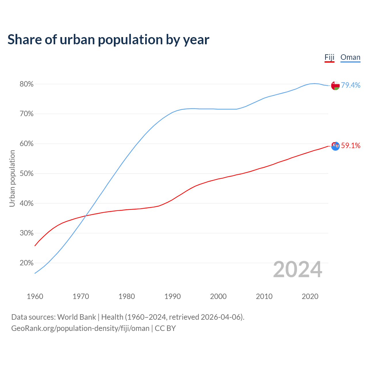 From 2004 to 2024, the share of urban population changed from 49.5% to 59.1% in Fiji and from 71.5% to 79.4% in Oman.