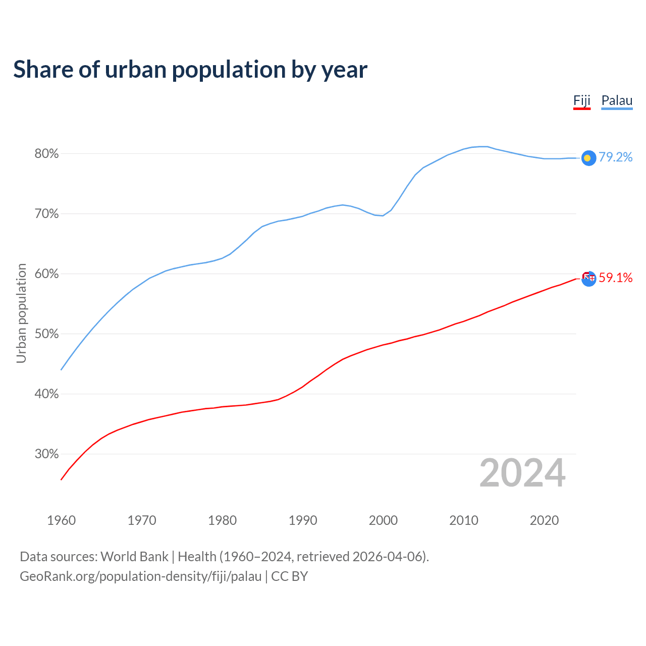 From 2004 to 2024, the share of urban population changed from 49.5% to 59.1% in Fiji and from 76.4% to 79.2% in Palau.