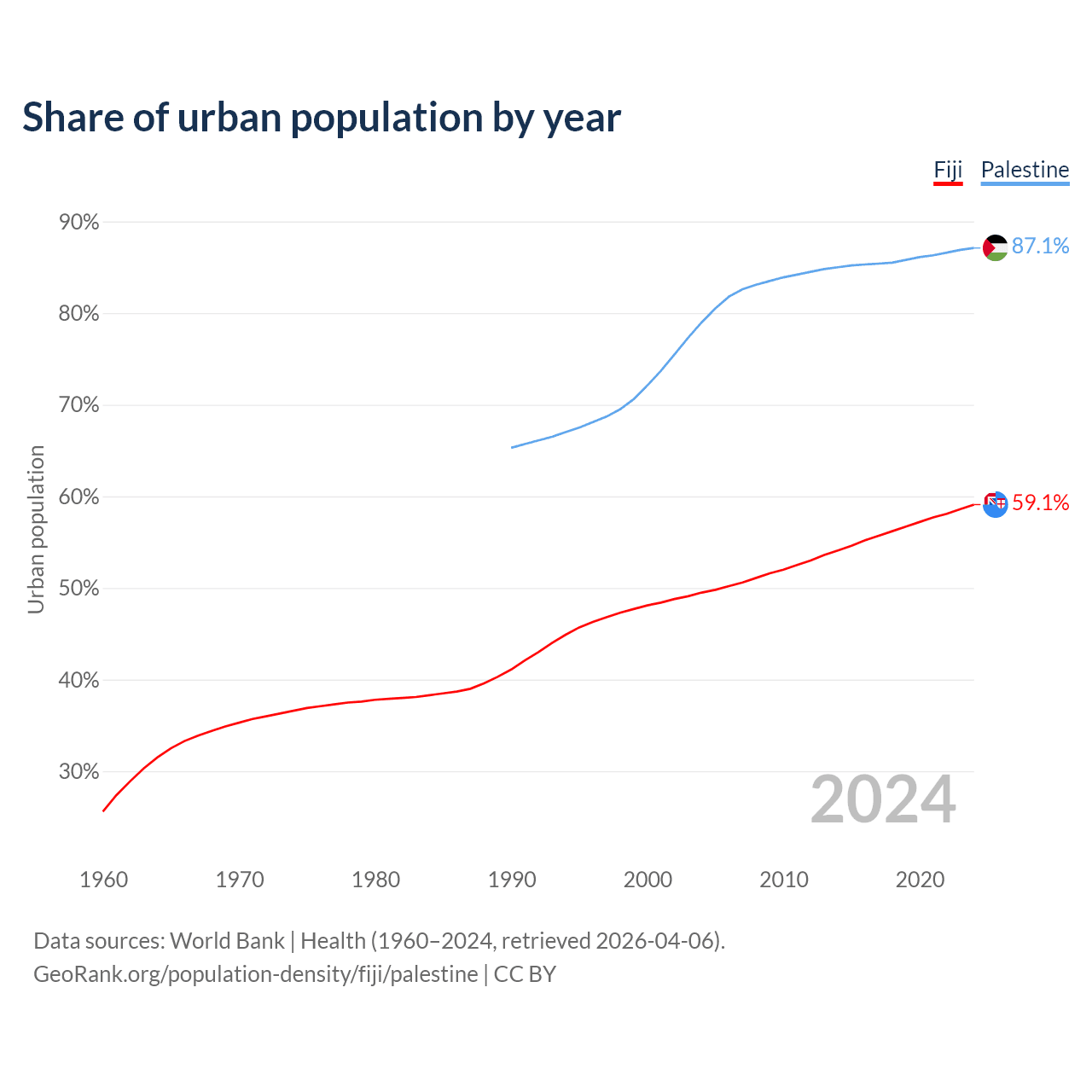 From 2004 to 2024, the share of urban population changed from 49.5% to 59.1% in Fiji and from 79% to 87.1% in Palestine.
