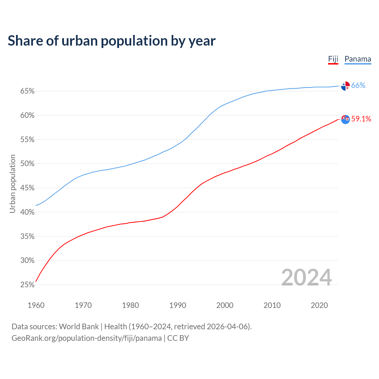 From 2004 to 2024, the share of urban population changed from 49.5% to 59.1% in Fiji and from 63.8% to 66% in Panama.