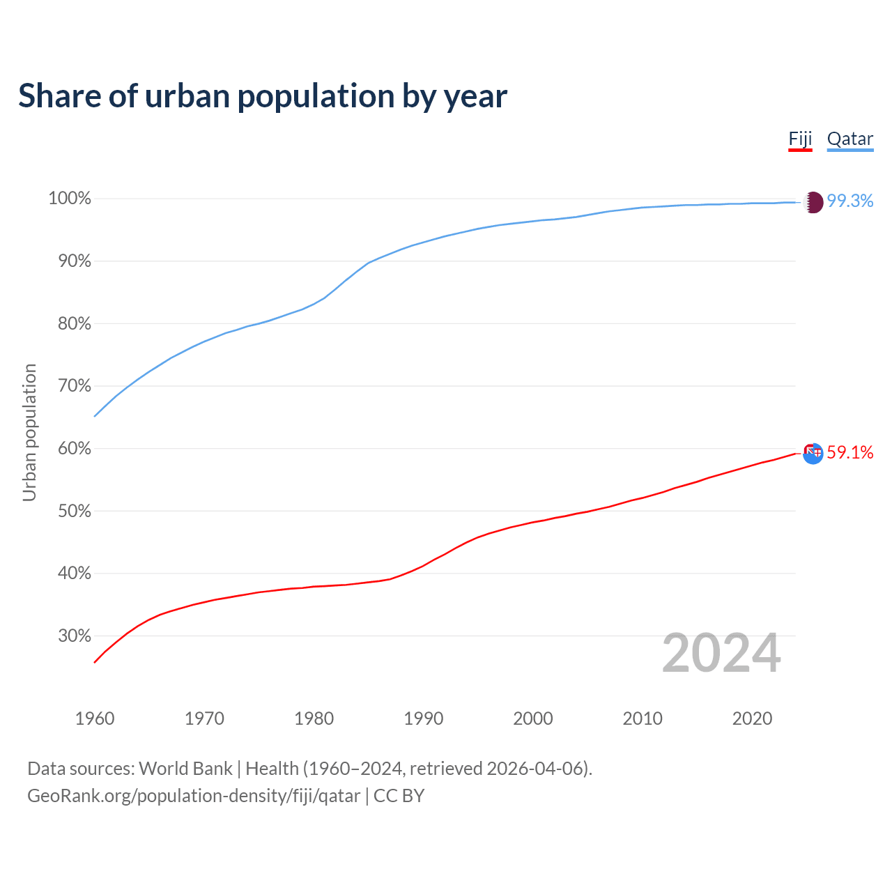 From 2004 to 2024, the share of urban population changed from 49.5% to 59.1% in Fiji and from 97% to 99.3% in Qatar.