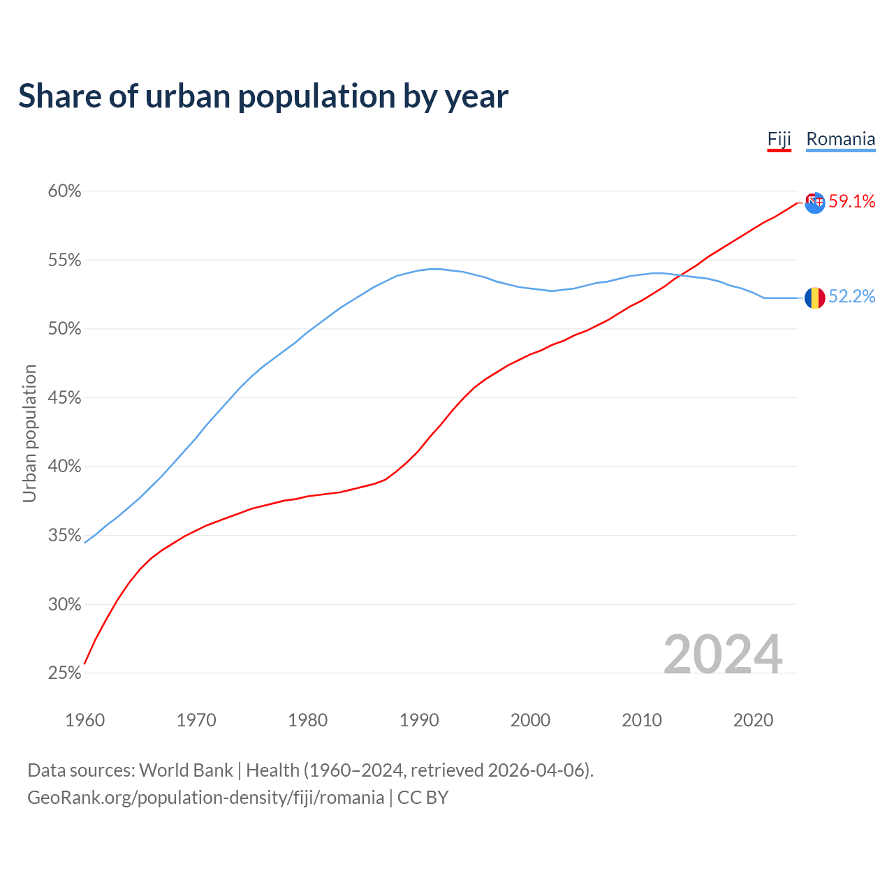 From 2004 to 2024, the share of urban population changed from 49.5% to 59.1% in Fiji and from 52.9% to 52.2% in Romania.