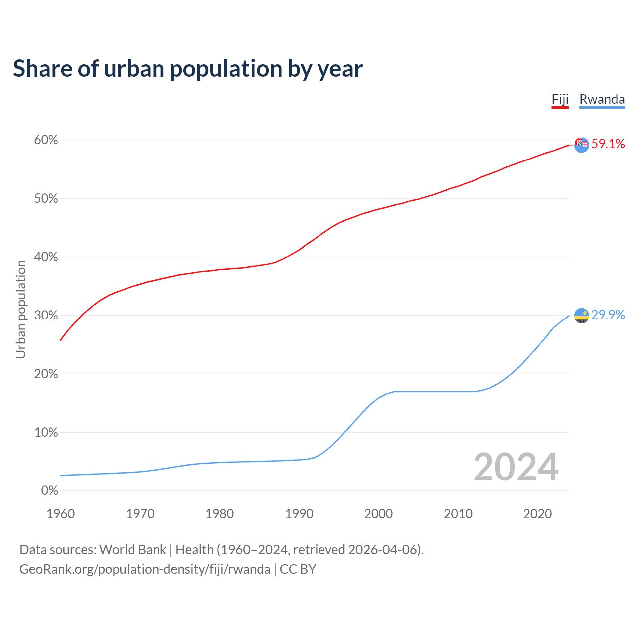 From 2006 to 2026, population density in Fiji increased by 5.3%, compared to a 60.1% growth in Rwanda.