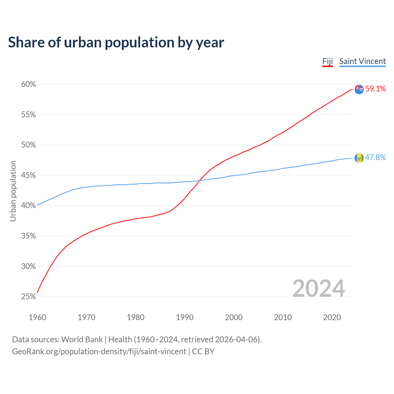 From 2004 to 2024, the share of urban population changed from 49.5% to 59.1% in Fiji and from 45.4% to 47.8% in Saint Vincent.