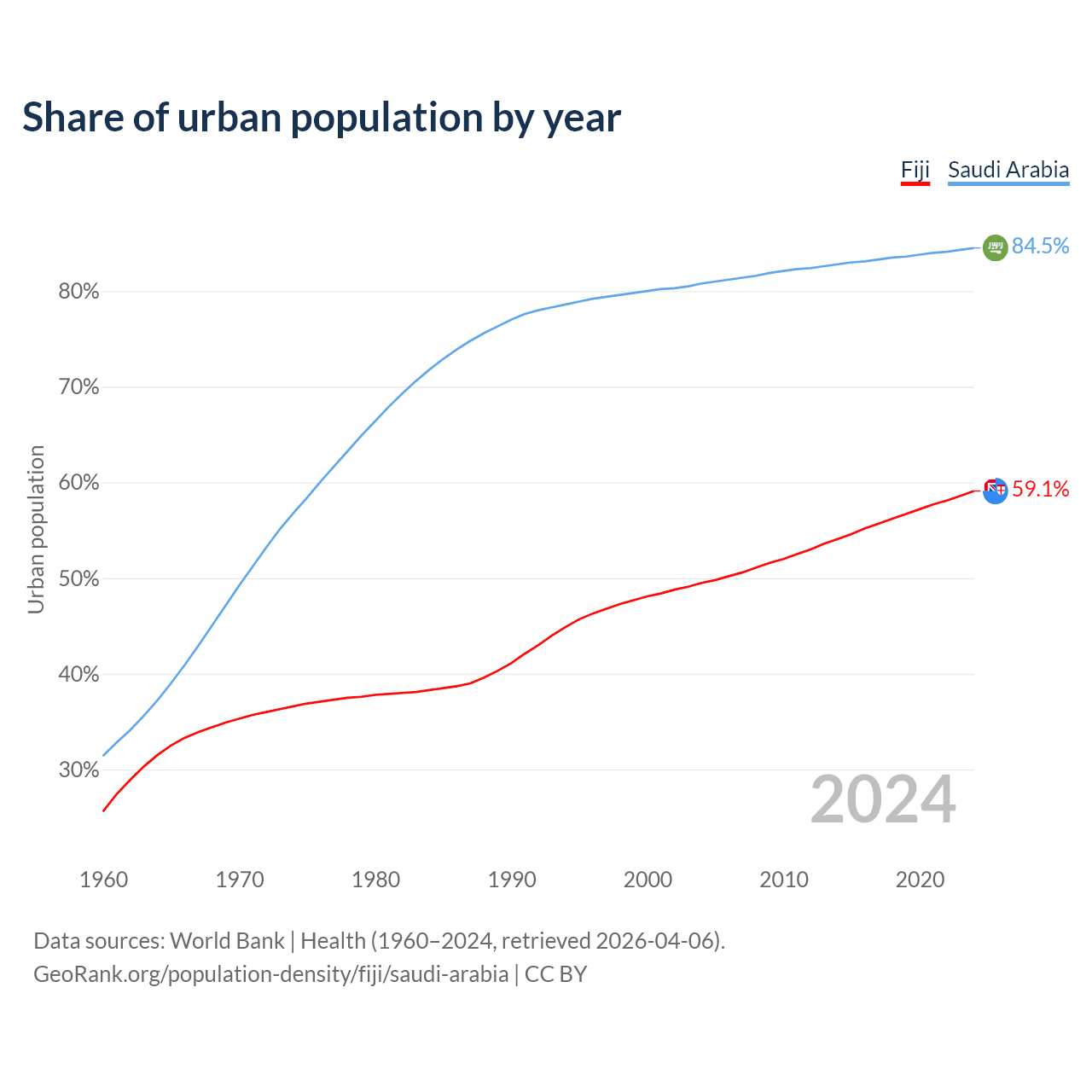 From 2004 to 2024, the share of urban population changed from 49.5% to 59.1% in Fiji and from 80.8% to 84.5% in Saudi Arabia.