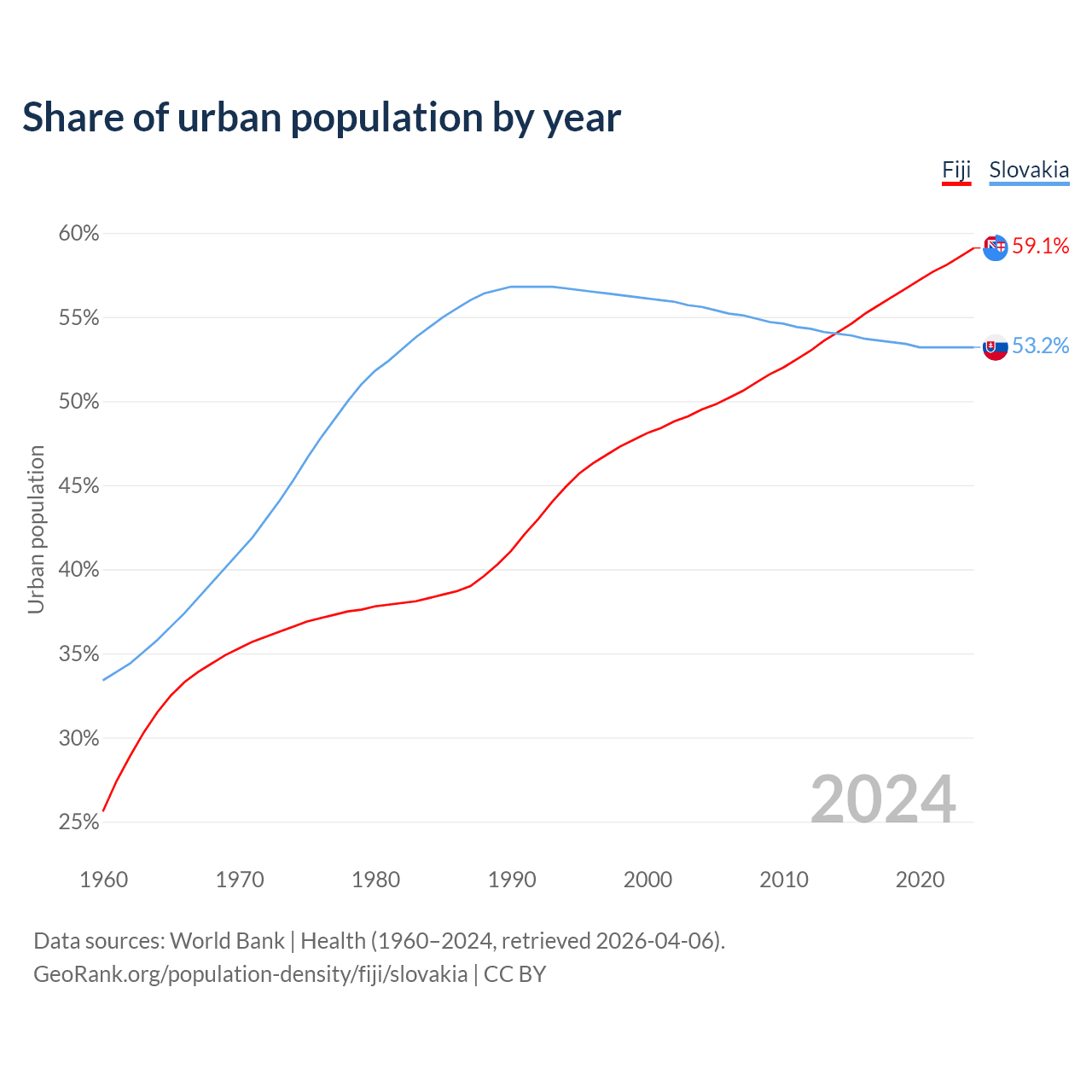 From 2006 to 2026, population density in Fiji increased by 5.3%, compared to a 0.21% decline in Slovakia.