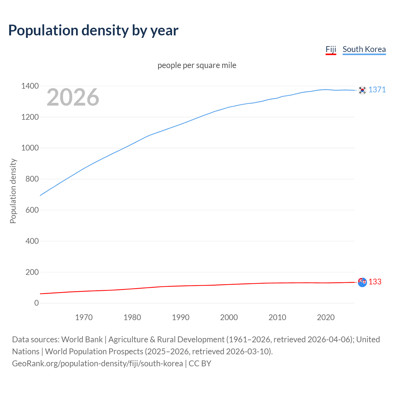 From 2006 to 2026, population density in Fiji increased by 5.3%, compared to a 5.84% growth in South Korea.