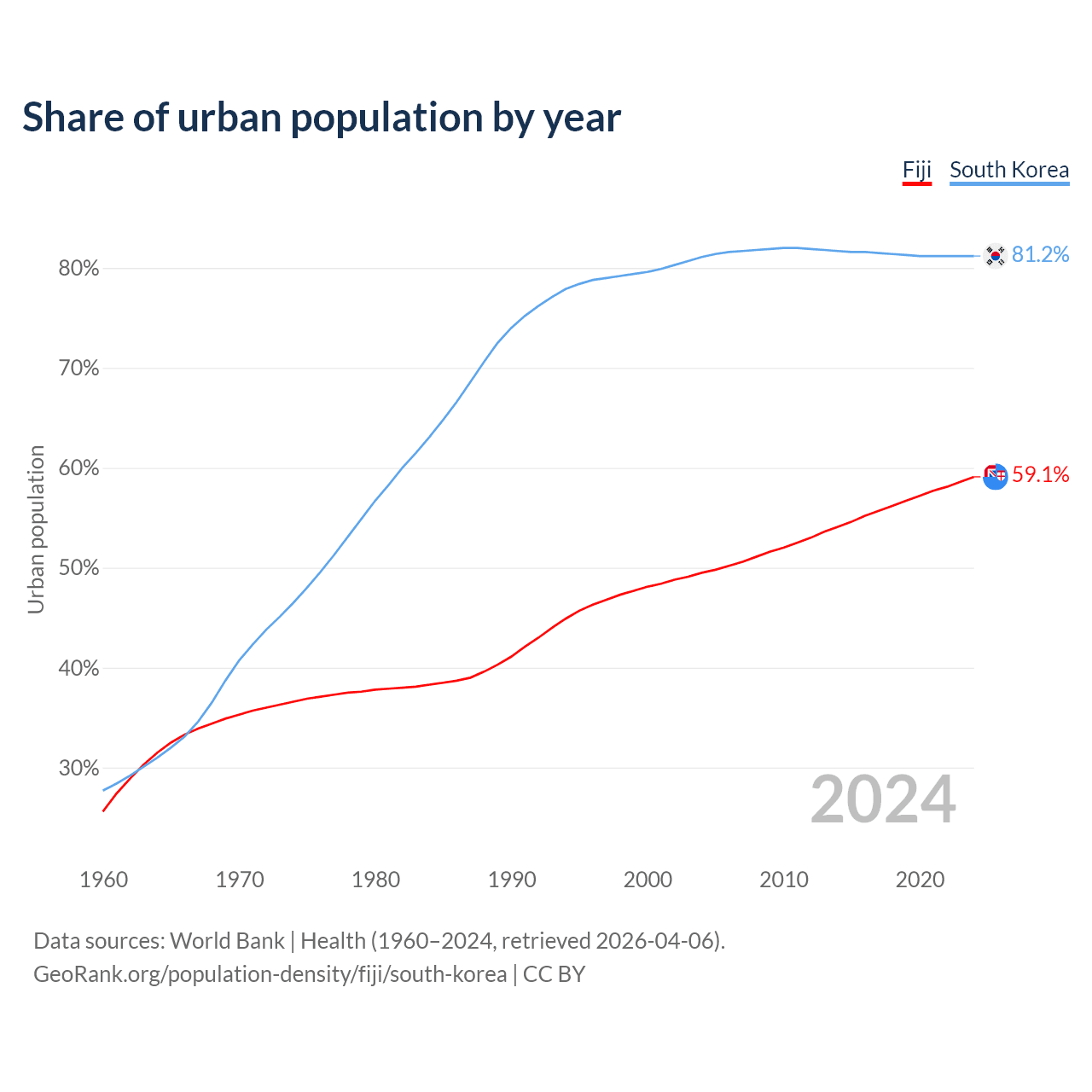 From 2004 to 2024, the share of urban population changed from 49.5% to 59.1% in Fiji and from 81.1% to 81.2% in South Korea.
