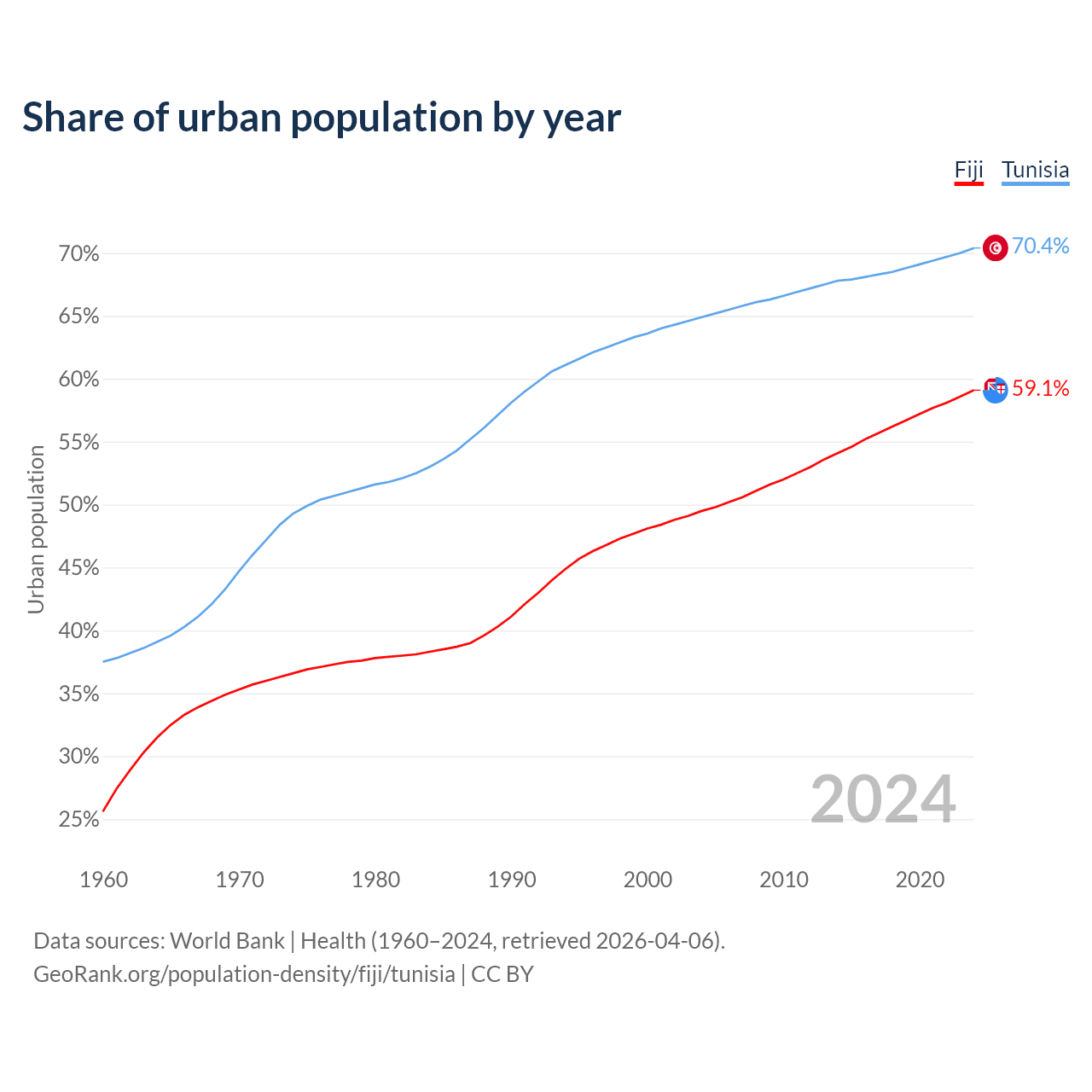 From 2004 to 2024, the share of urban population changed from 49.5% to 59.1% in Fiji and from 64.9% to 70.4% in Tunisia.