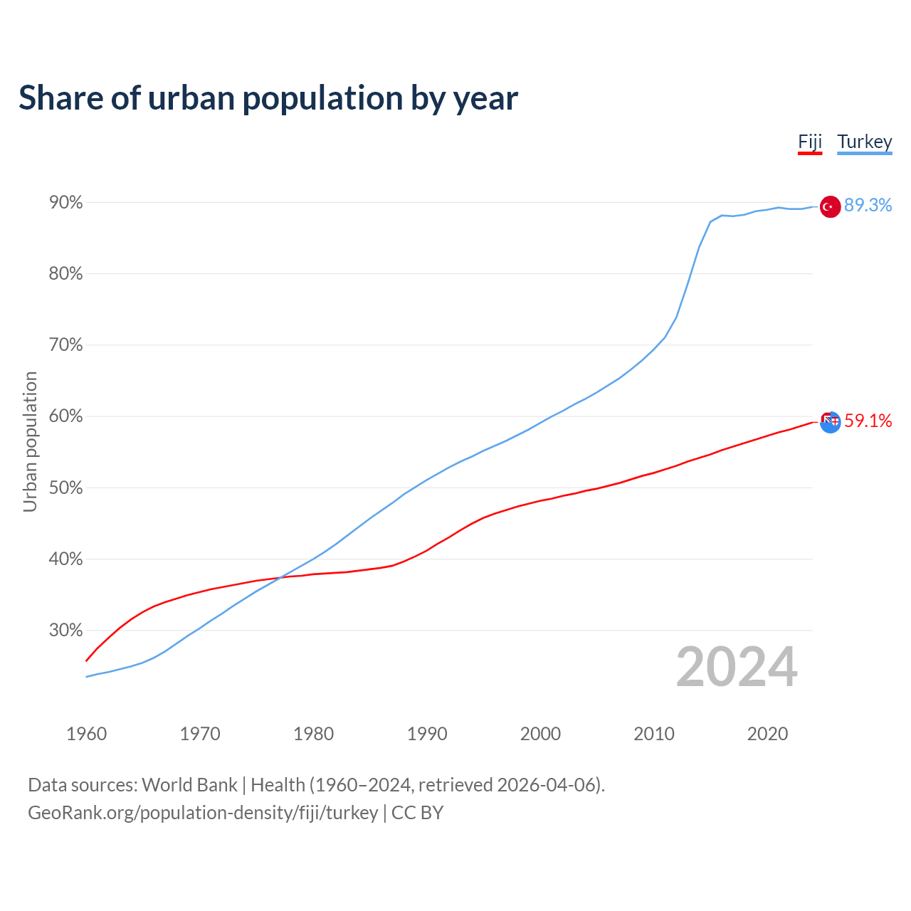 From 2004 to 2024, the share of urban population changed from 49.5% to 59.1% in Fiji and from 62.4% to 89.3% in Turkey.