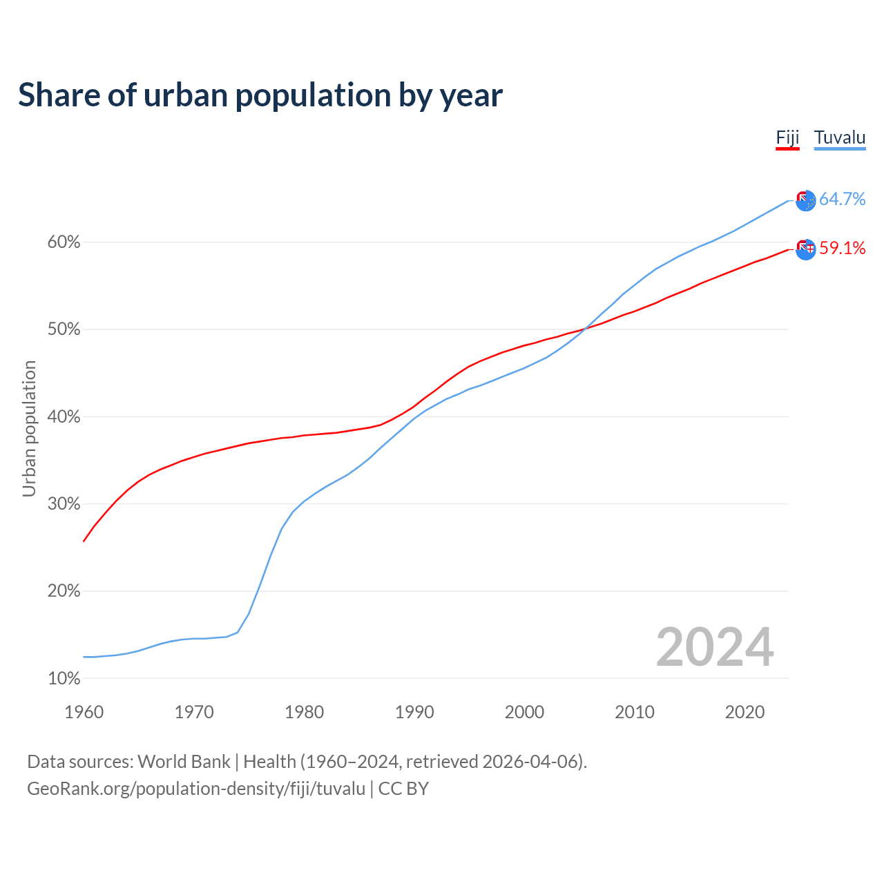 From 2004 to 2024, the share of urban population changed from 49.5% to 59.1% in Fiji and from 48.4% to 64.7% in Tuvalu.
