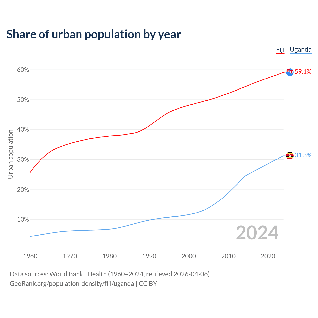 From 2004 to 2024, the share of urban population changed from 49.5% to 59.1% in Fiji and from 13.1% to 31.3% in Uganda.