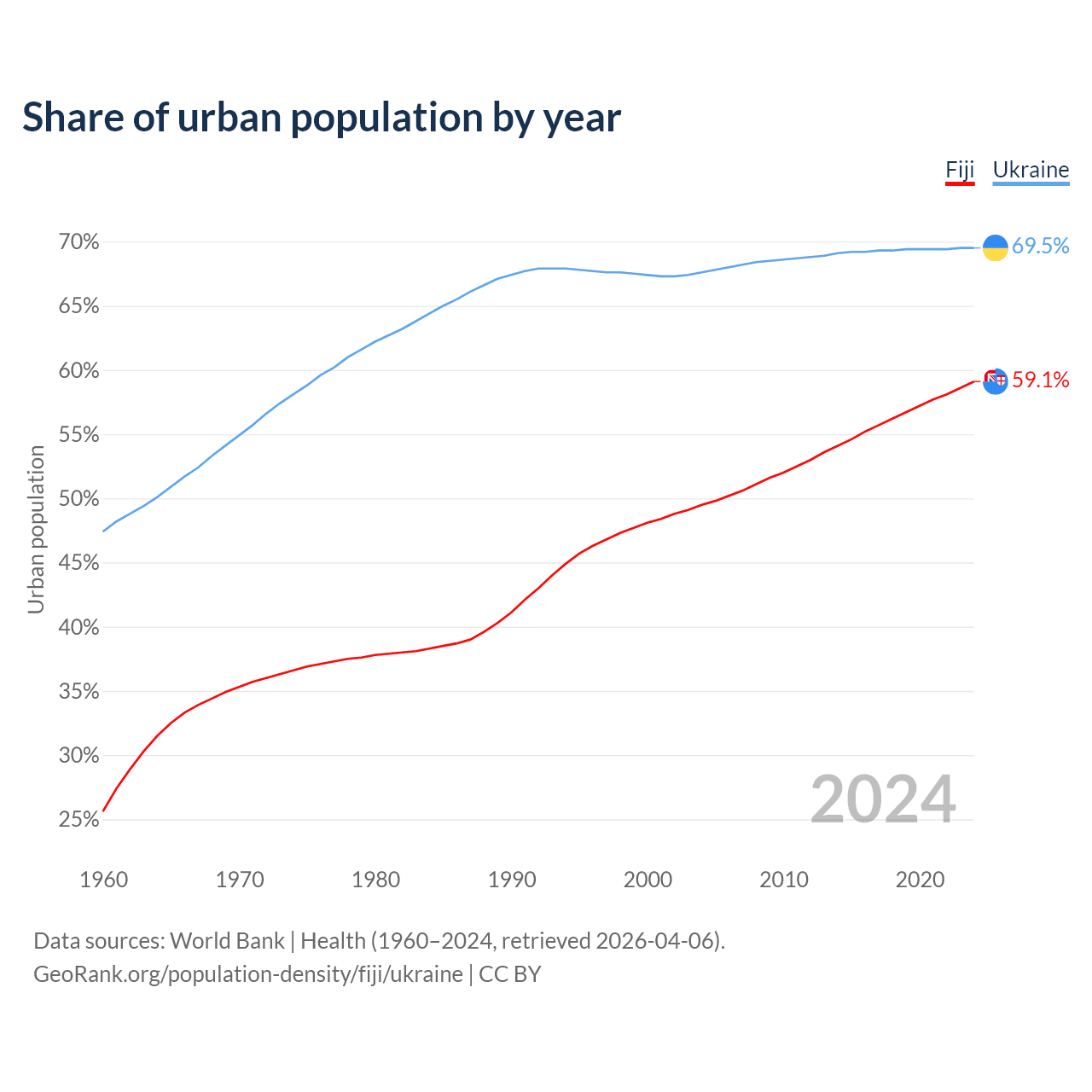 From 2004 to 2024, the share of urban population changed from 49.5% to 59.1% in Fiji and from 67.6% to 69.5% in Ukraine.