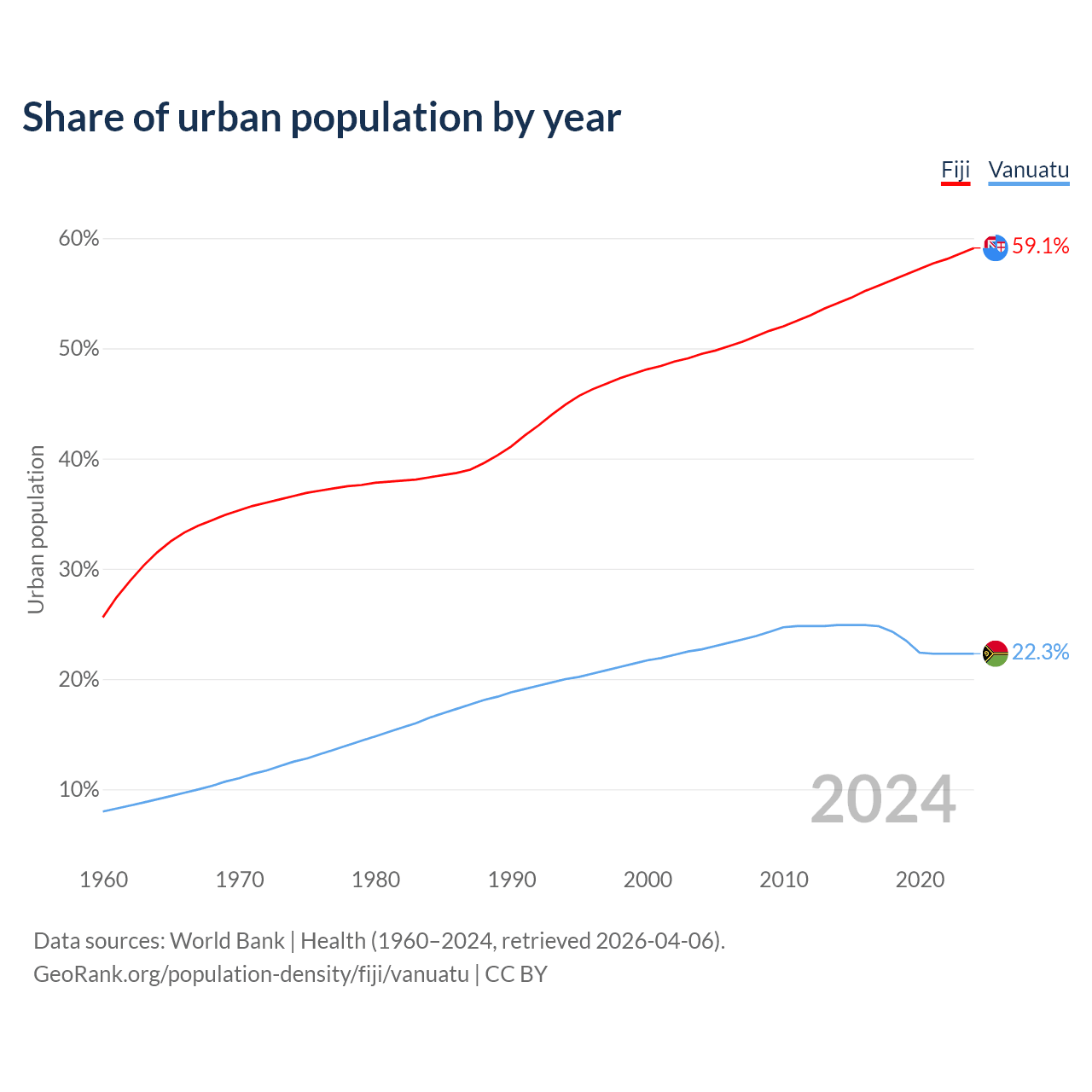 From 2004 to 2024, the share of urban population changed from 49.5% to 59.1% in Fiji and from 22.7% to 22.3% in Vanuatu.