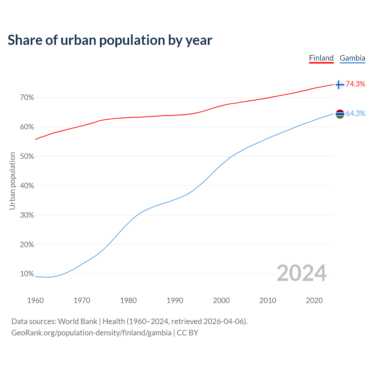 From 2004 to 2024, the share of urban population changed from 68.3% to 74.3% in Finland and from 51.5% to 64.3% in the Gambia.