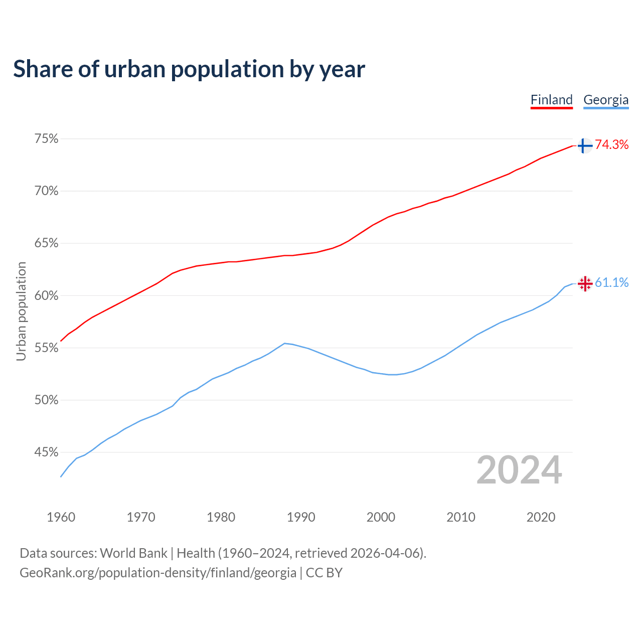 From 2004 to 2024, the share of urban population changed from 68.3% to 74.3% in Finland and from 52.7% to 61.1% in Georgia.