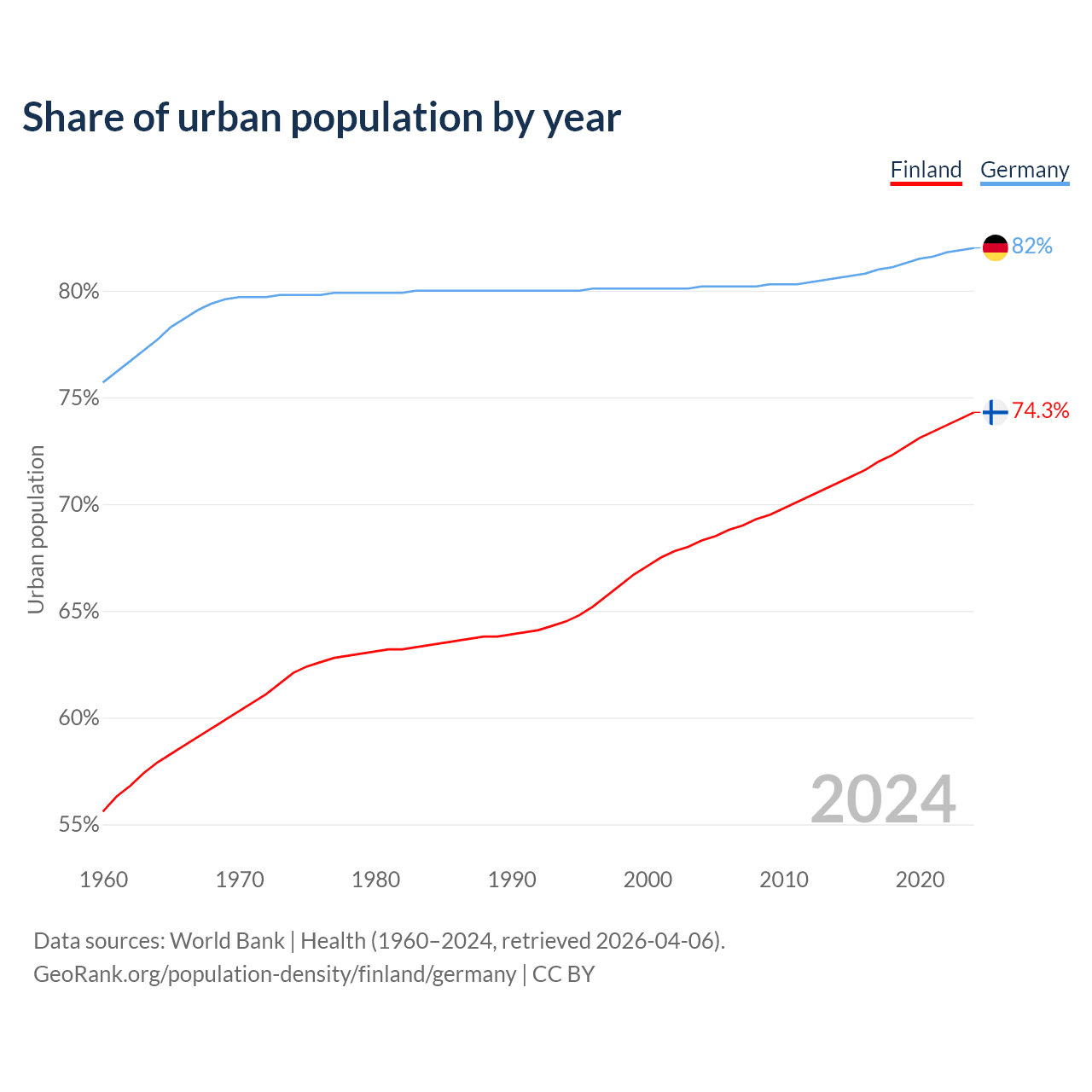 From 2004 to 2024, the share of urban population changed from 68.3% to 74.3% in Finland and from 80.2% to 82% in Germany.