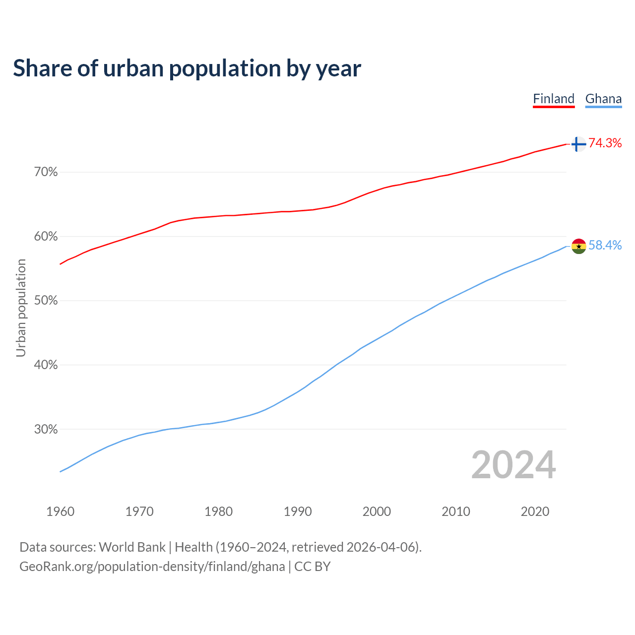 From 2004 to 2024, the share of urban population changed from 68.3% to 74.3% in Finland and from 46.8% to 58.4% in Ghana.