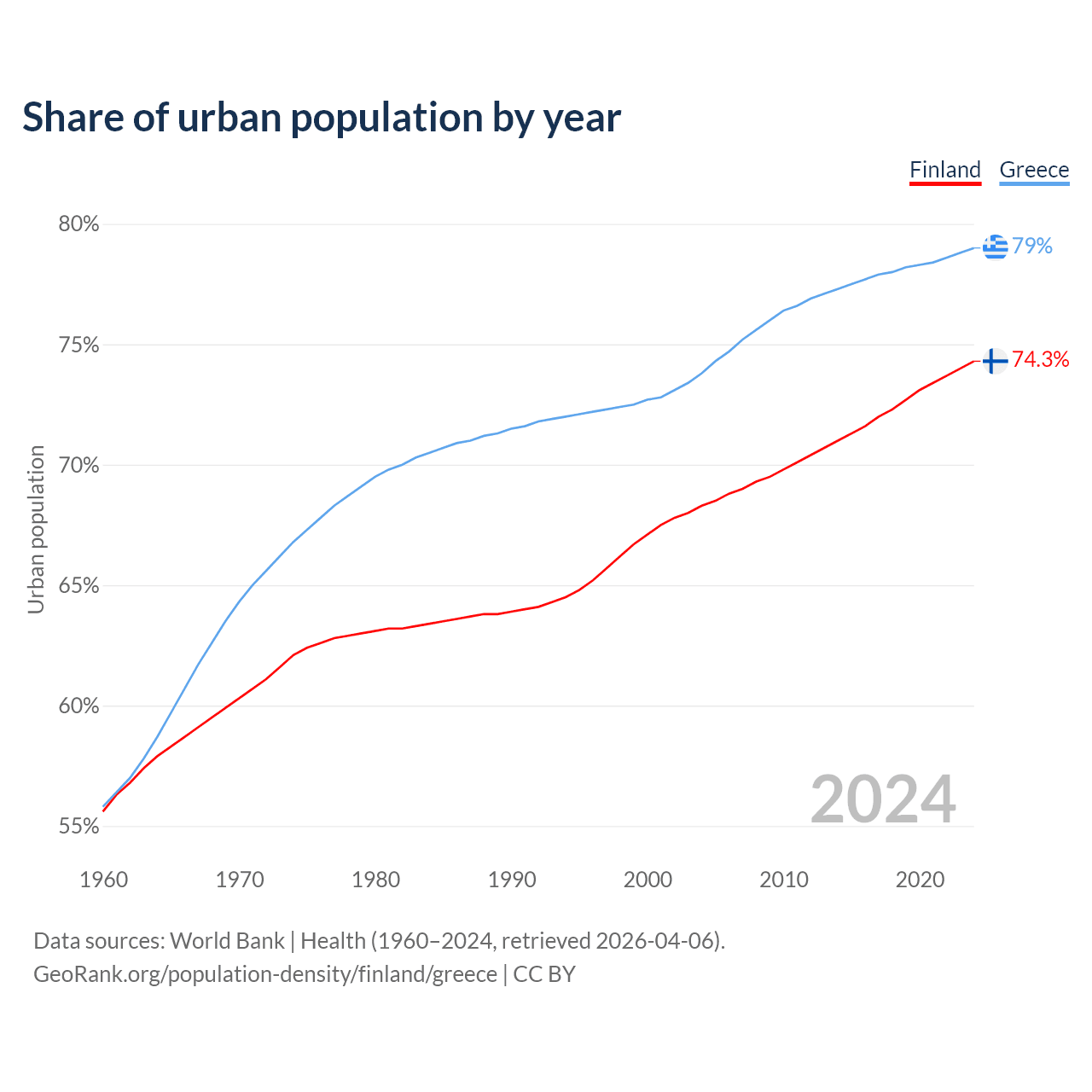 From 2004 to 2024, the share of urban population changed from 68.3% to 74.3% in Finland and from 73.8% to 79% in Greece.