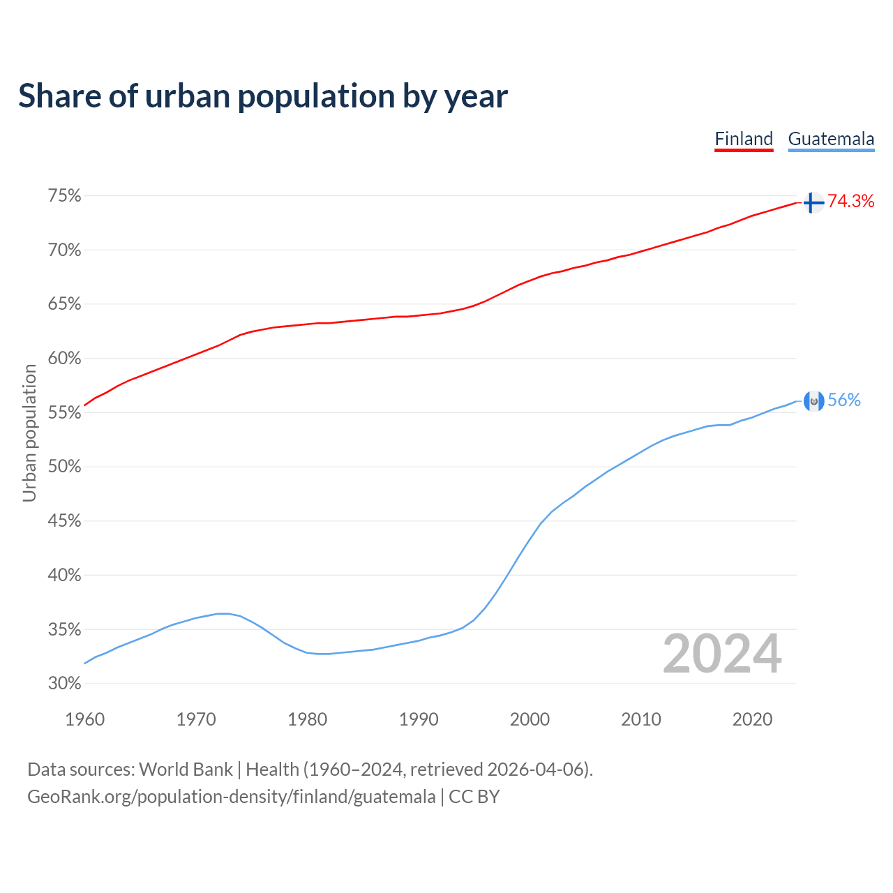 From 2004 to 2024, the share of urban population changed from 68.3% to 74.3% in Finland and from 47.3% to 56% in Guatemala.