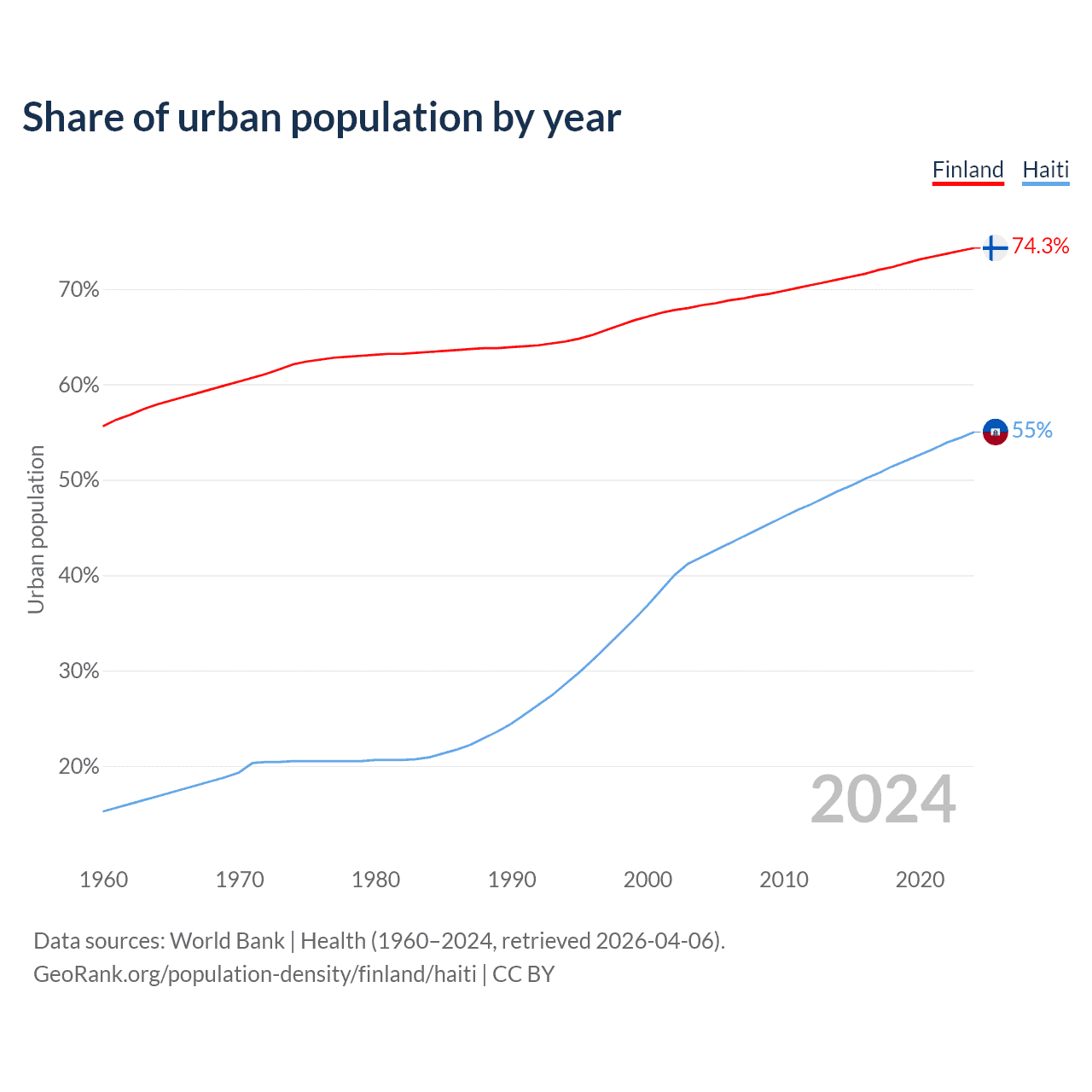 From 2004 to 2024, the share of urban population changed from 68.3% to 74.3% in Finland and from 41.9% to 55% in Haiti.