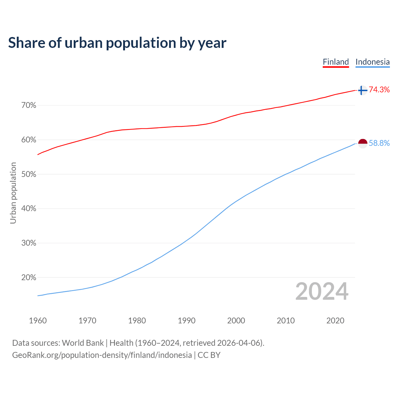 From 2004 to 2024, the share of urban population changed from 68.3% to 74.3% in Finland and from 45.4% to 58.8% in Indonesia.