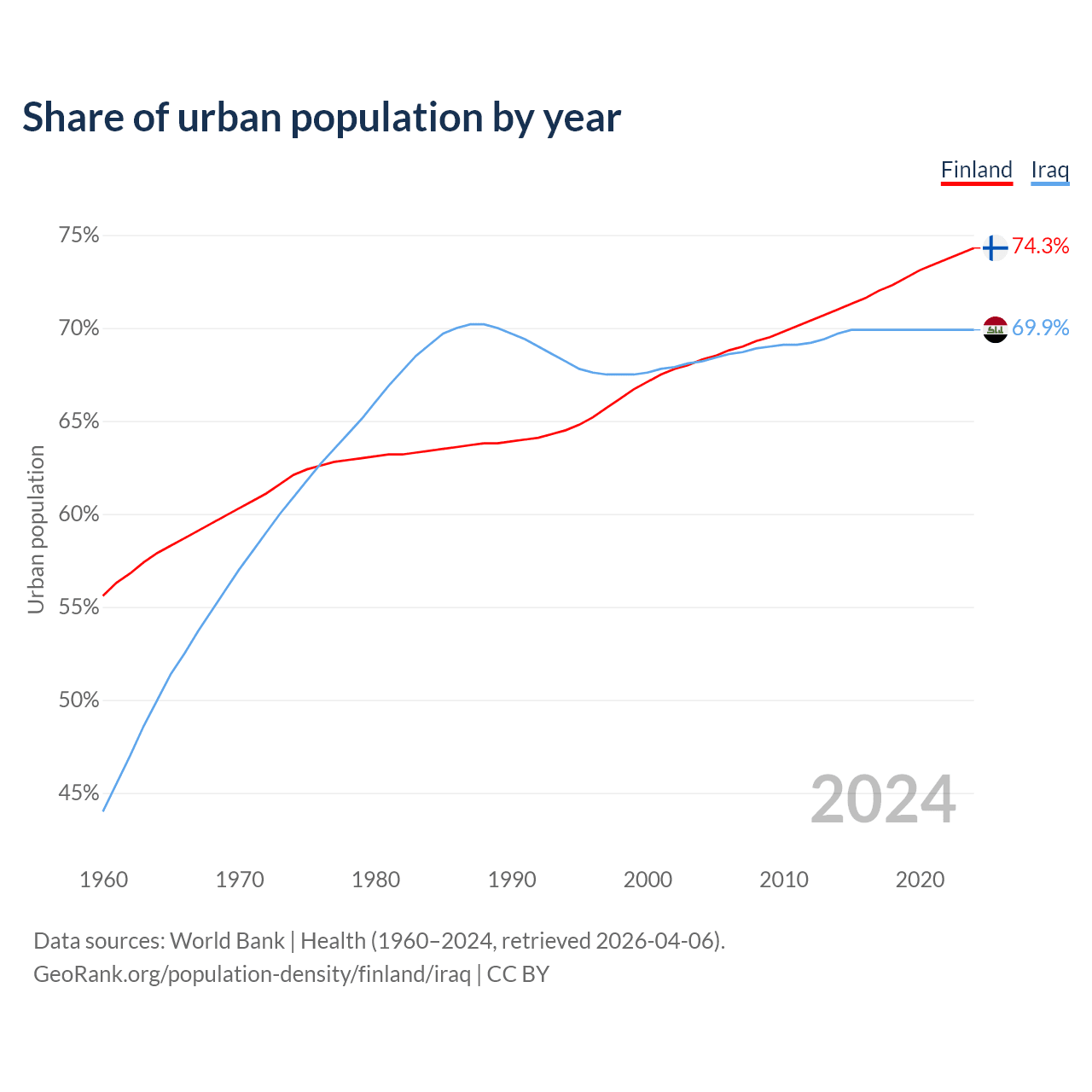 From 2004 to 2024, the share of urban population changed from 68.3% to 74.3% in Finland and from 68.2% to 69.9% in Iraq.
