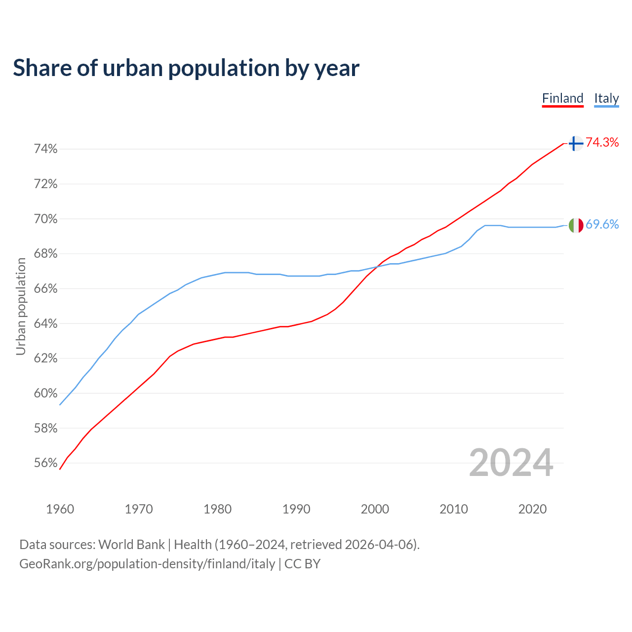 From 2004 to 2024, the share of urban population changed from 68.3% to 74.3% in Finland and from 67.5% to 69.6% in Italy.