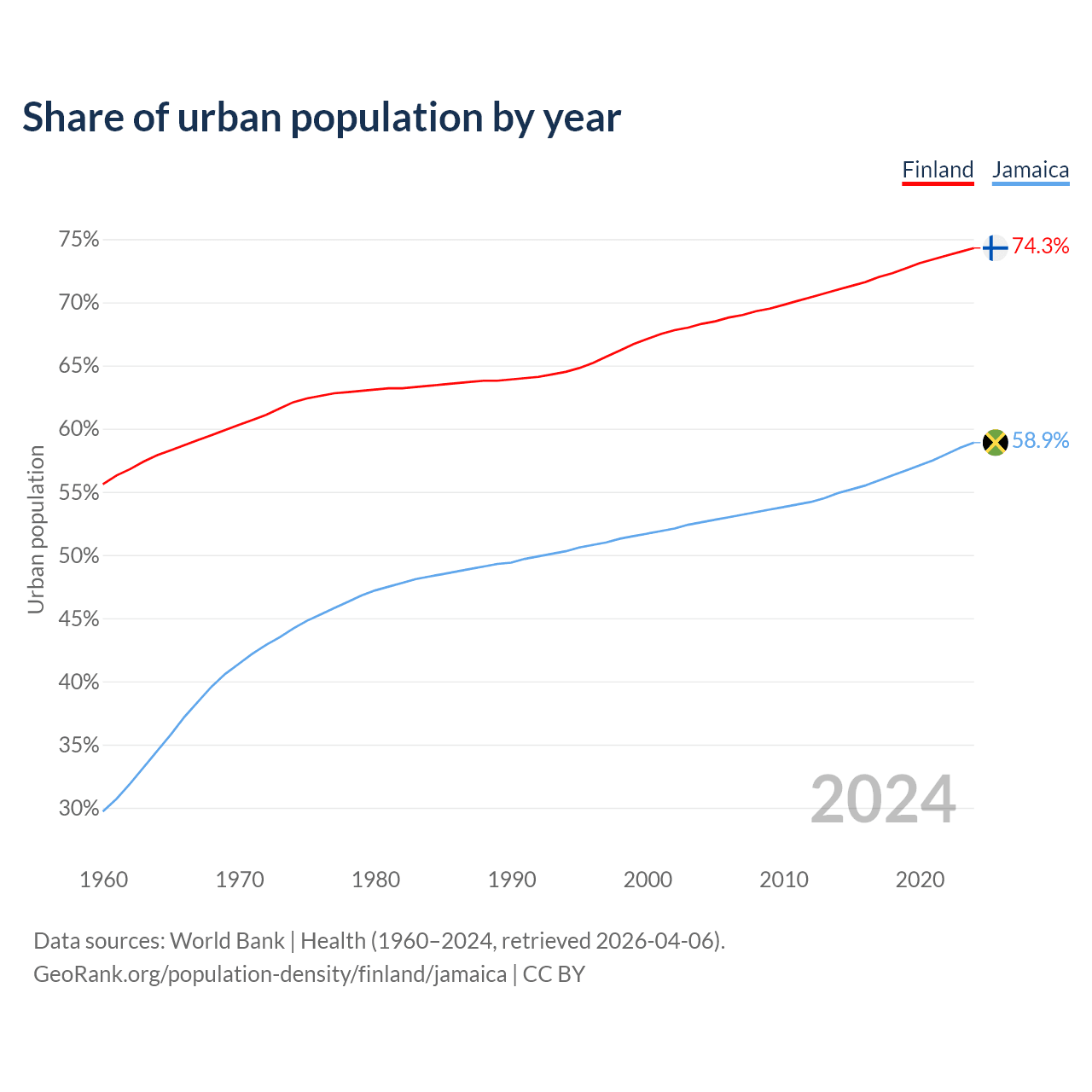 From 2004 to 2024, the share of urban population changed from 68.3% to 74.3% in Finland and from 52.6% to 58.9% in Jamaica.