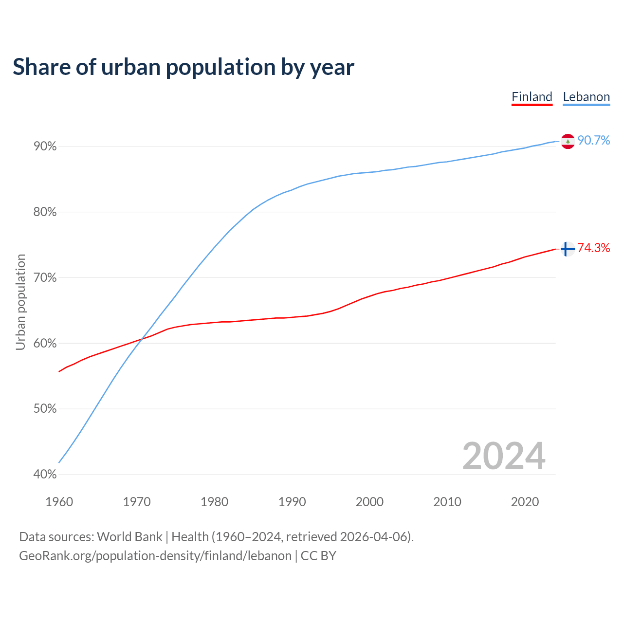 From 2004 to 2024, the share of urban population changed from 68.3% to 74.3% in Finland and from 86.6% to 90.7% in Lebanon.