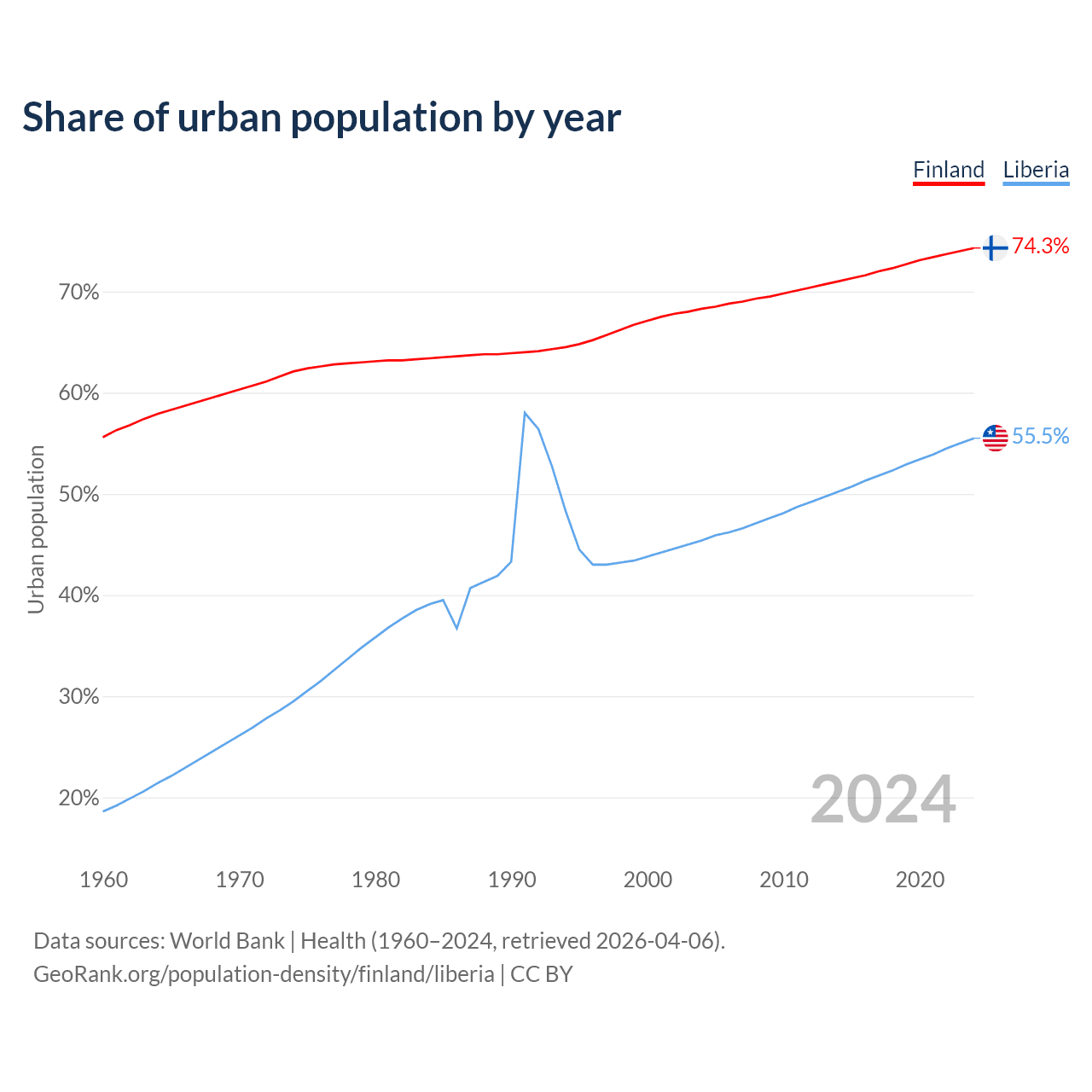 From 2004 to 2024, the share of urban population changed from 68.3% to 74.3% in Finland and from 45.4% to 55.5% in Liberia.