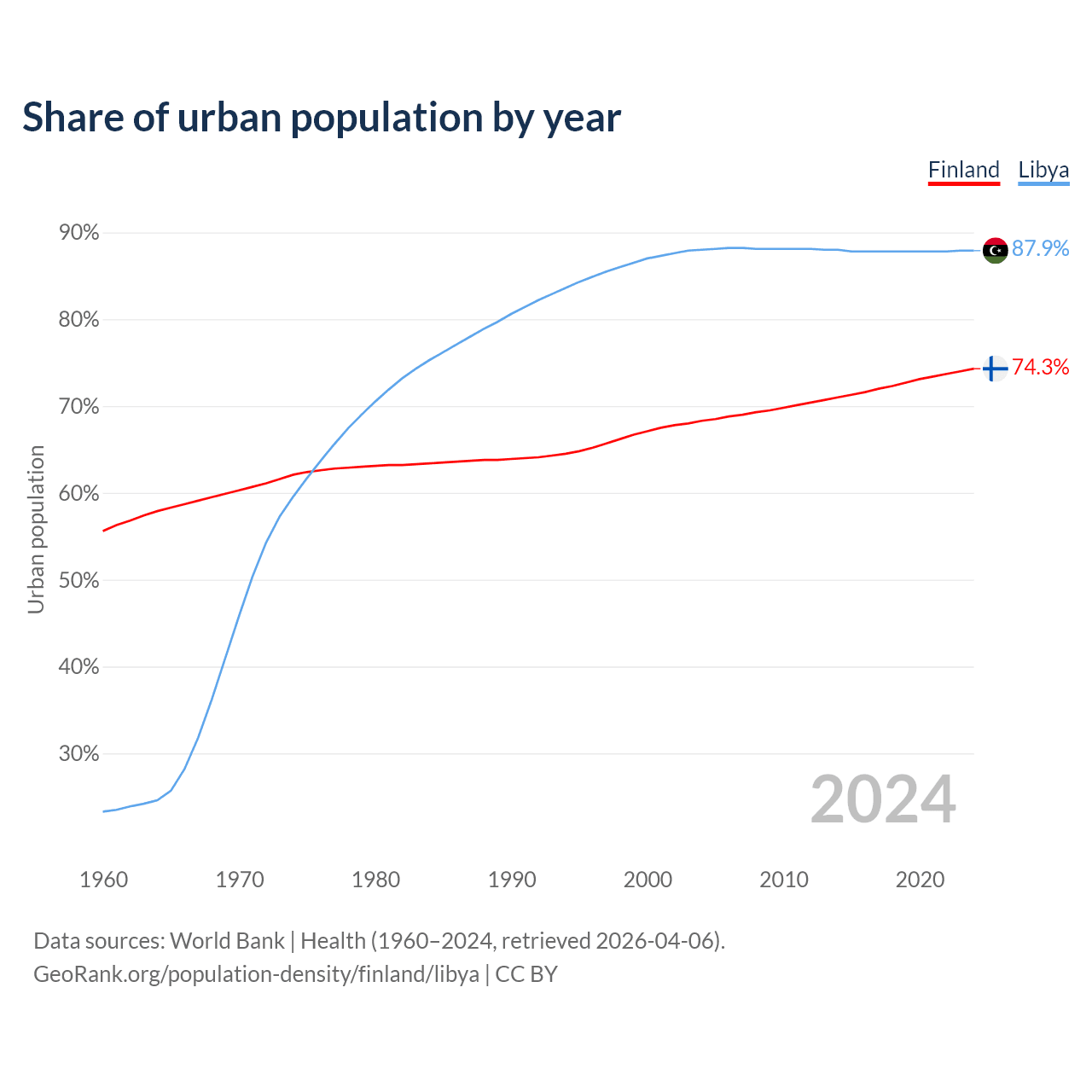From 2004 to 2024, the share of urban population changed from 68.3% to 74.3% in Finland and from 88% to 87.9% in Libya.