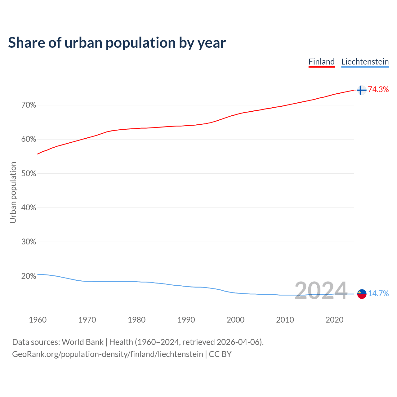 From 2004 to 2024, the share of urban population changed from 68.3% to 74.3% in Finland and from 14.7% to 14.7% in Liechtenstein.
